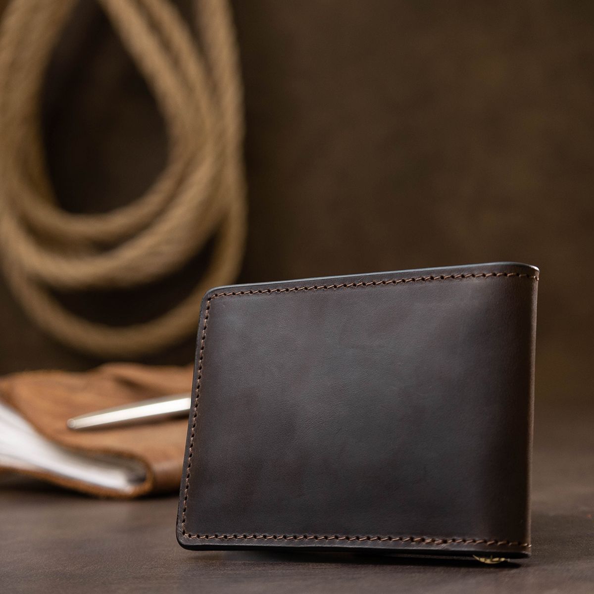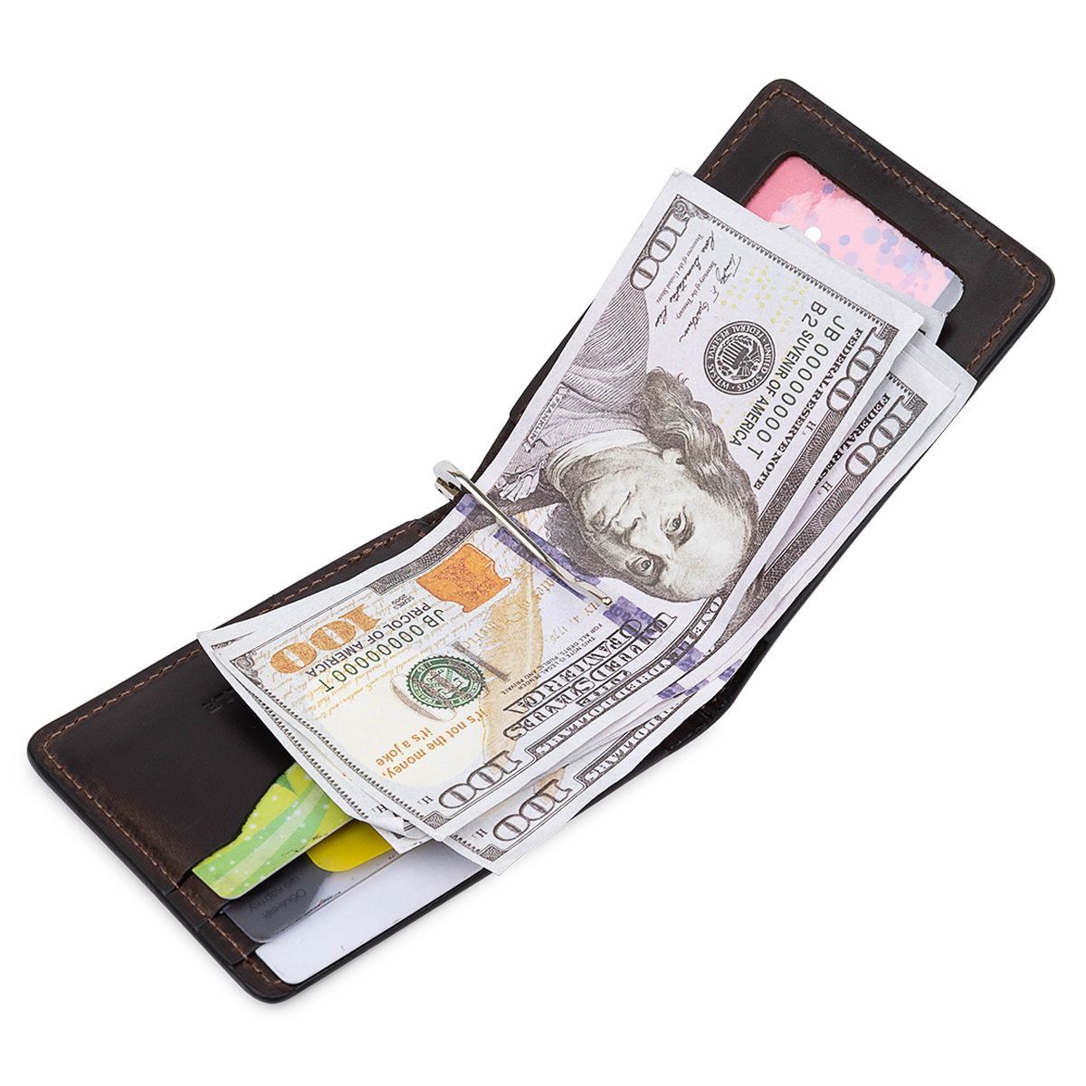 Мужской классический зажим для тех, кто не любит громоздких кошельков. Материал изготовления – натуральная кожа с высокой стойкостью к износу. Внутри кроме зажима есть слоты для карточек и два кармана, один из которых – прозрачный. Упаковано изделие в фирменный плотный чехол.
