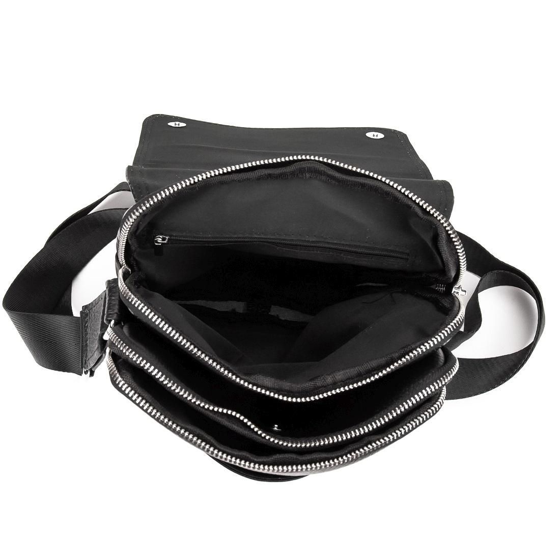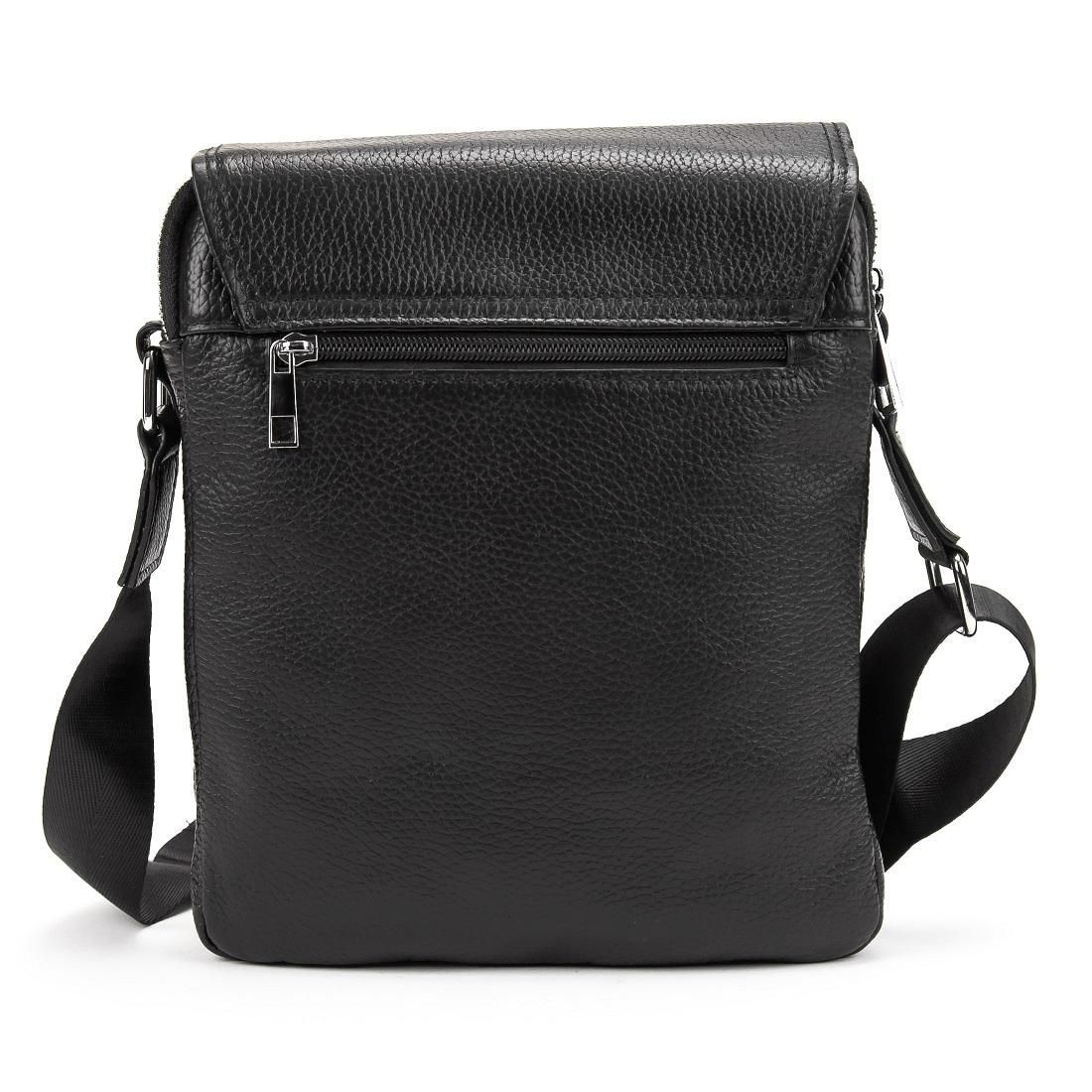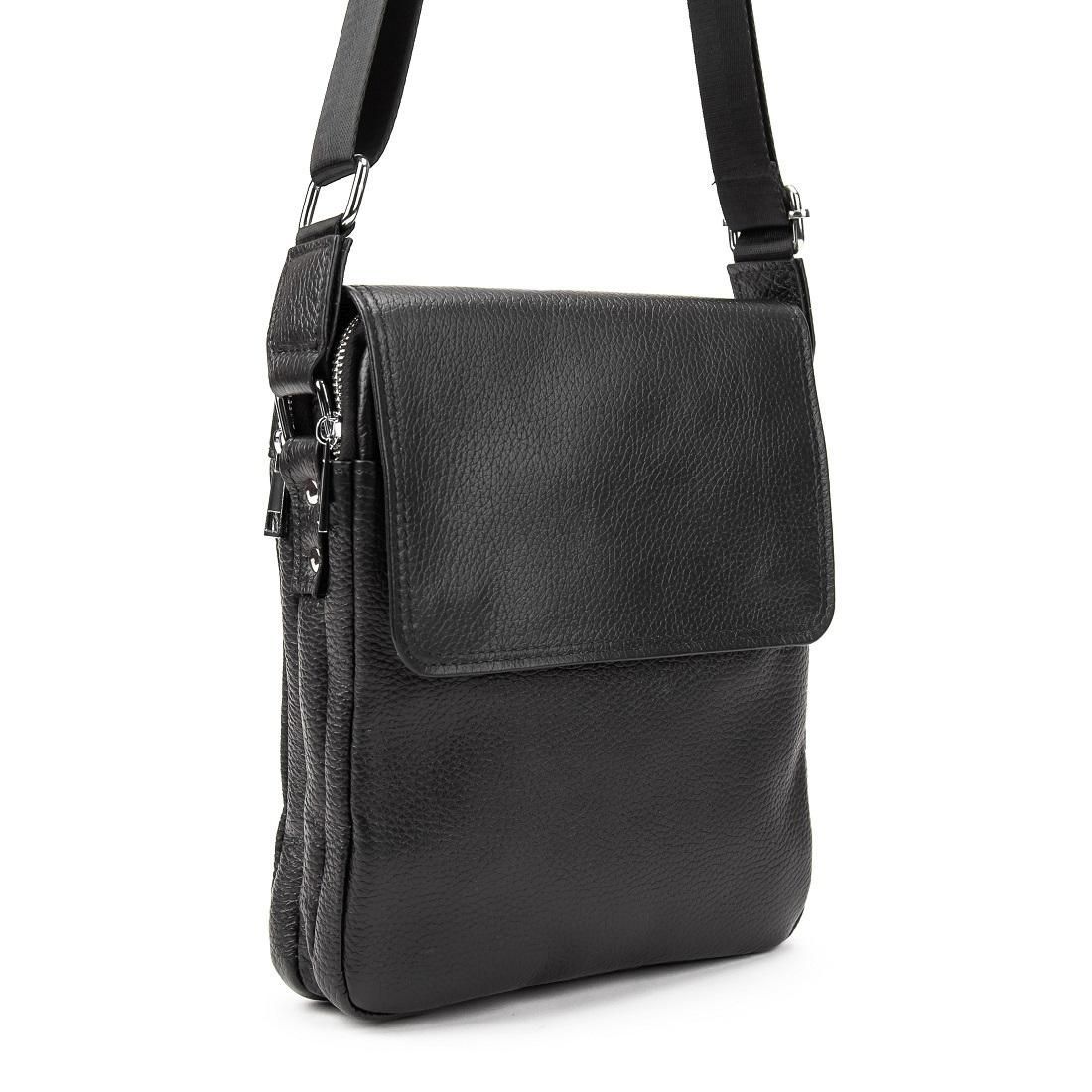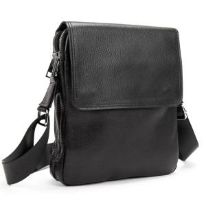 Сумка через плече Tiding Bag M56-3508A із натуральної шкіри у чорному кольорі, зернистої фактури. Розмір: 21 x 5 x 26см. У сумці є три відділення: два на блискавках та третє між ними на магнітній кнопці. Також усередині знаходиться невелика потаємна кишенька. Ще одна кишеня на змійці розташована з тильного зовнішнього боку месенджера. Месенджер має довгий текстильний ремінець, з регулятором довжини. Клапан фіксується магнітними кнопками. Підкладка: текстиль. Колір: чорний. Колір фурнітури: срібло.
