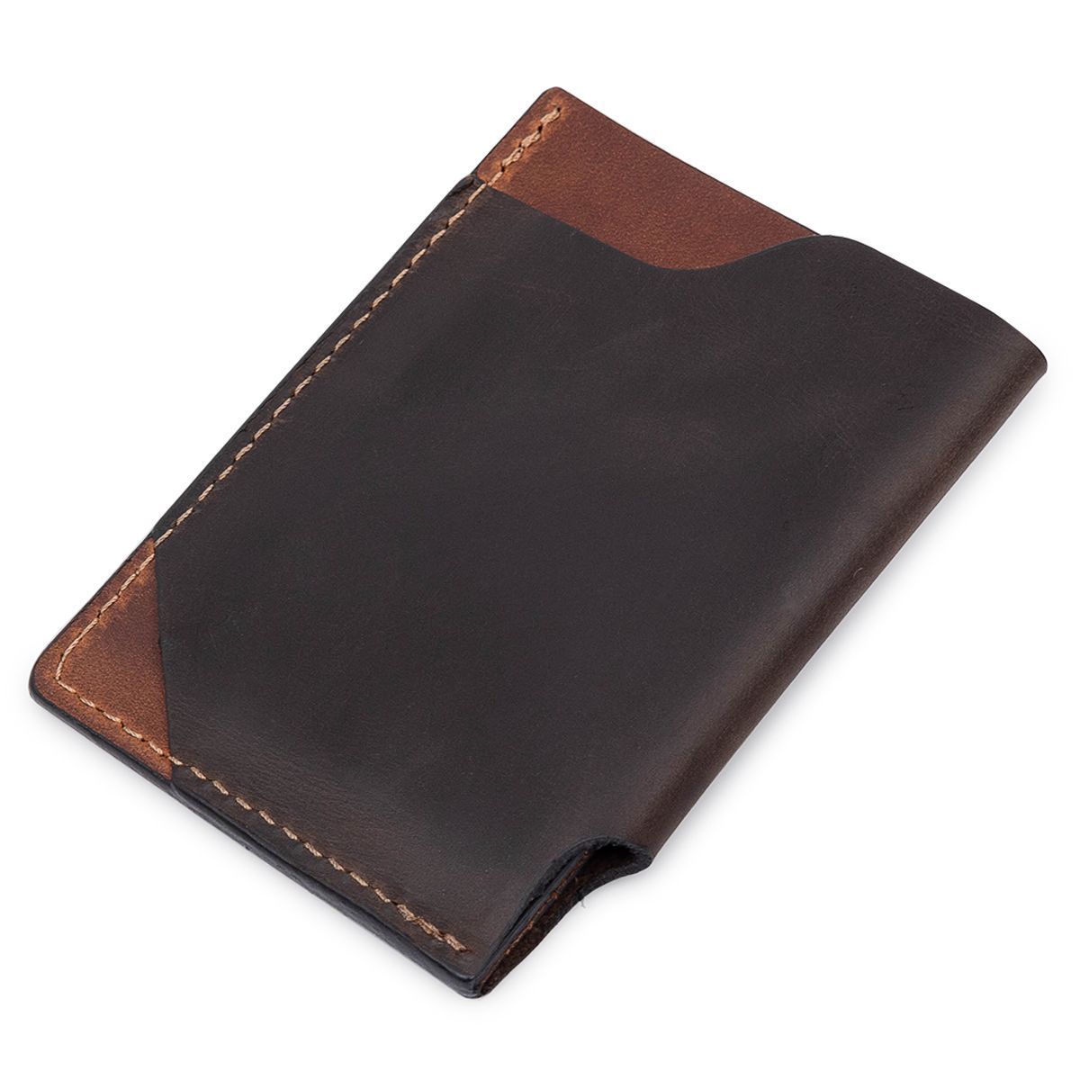 Необычный картхолдер из натуральной кожи высокого качества. Имеет гладкую матовую фактуру и хорошее сочетание коричневого цвета разных оттенков. На лицевой стороне есть тиснение логотипа бренда. Упакованное изделие в фирменный чехол, потому может стать хорошим презентом для близкого человека.