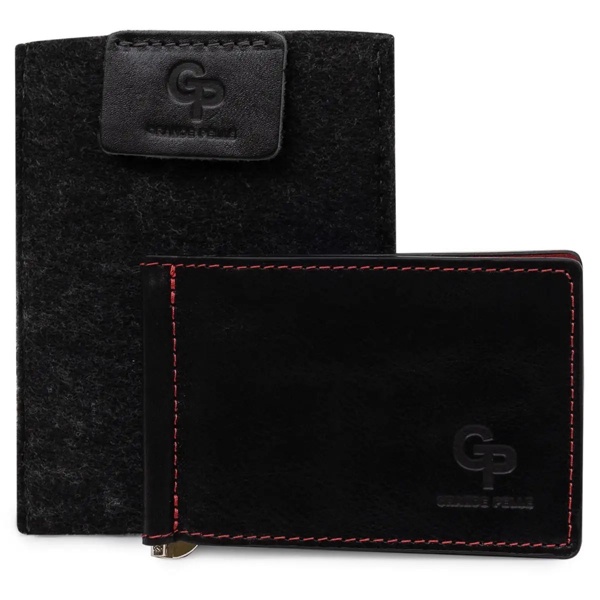 Стильный кожаный зажим для денег с хорошим сочетанием черного и красного цвета, по периметру также строчка с красной нитью. Внутри расположились металлический зажим, слоты для пластиковых и визитных карточек и два потайных кармана. Само изделие упаковано в фирменный уплотненный чехол.