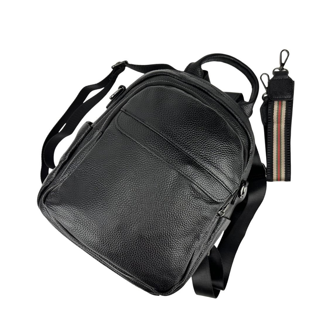 Міський жіночий рюкзак із натуральної шкіри Olivia Leather F-FL-NWBP27-8061A має розміри 30,5 x 26,7 x 12,7 см. Рюкзак оснащений одним головним відділенням із блискавкою та має відкриті кишені і дві кишені на блискавці всередині. На передній частині розташований відділ на блискавці та кишеня з блискавкою, а ззаду – додаткова кишеня на блискавці. З боків знаходяться кишені для дрібниць. Рюкзак має м'яку структуру та текстильну підкладку, а текстильний плечовий ремінець регулюється по довжині. Виріб виконаний у чорному кольорі з сріблястою фурнітурою