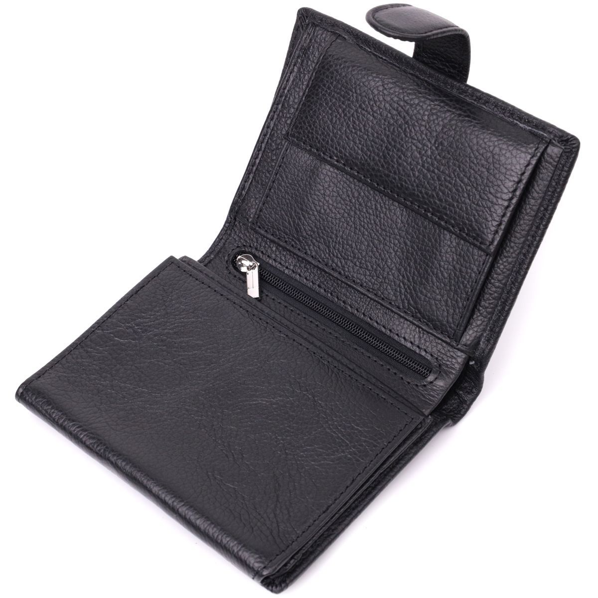 Добротне чоловіче портмоне, яке прикрашене металевим логотипом виробника на лицьовій стороні. Аксесуар з натуральної шкіри, він складається з одного відділення для купюр, кишені на блискавці, чотирьох осередків для карт, трьох прихованих кишень, двох кишень під плівкою та кишені для монет. Портмоне доповнено надійною фурнітурою та міцною підкладкою, закривається навпіл, хлястиком на кнопку. Шкіряний та якісний аксесуар на подарунок, це завжди дуже хороша ідея.