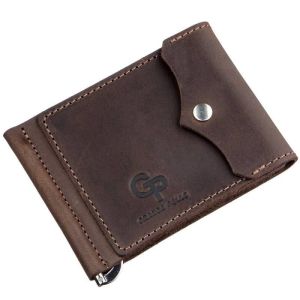 Компактний затиск із італійської натуральної шкіри найвищої якості коричневого кольору. На лицьовій стороні аксесуара тиснений логотип бренда-виробника. Затискач стане вам ідеальним рішенням, якщо ви не є шанувальником портмоне або клатчею. За рахунок свого невеликого розміру затискач легко поміститься в кишеню або невелику сумку. Ви також можете покласти в нього пару необхідних кредиток. Сама конструкція затиску виготовлена з надійного металу. Виріб стане чудовим подарунком для близької людини. Модель упакована у повстяний чохол.