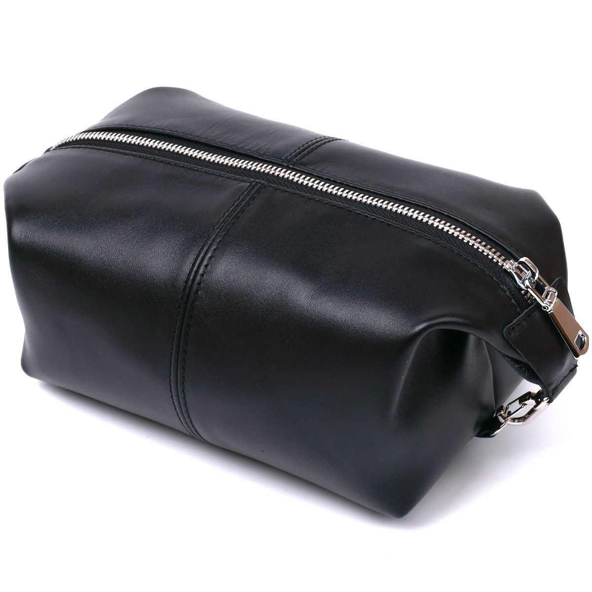 Прекрасная косметичка для хранения ценных вещей в аккуратном дизайне от украинского производителя. Выполнена эта модель из натуральной высококлассной кожи повышенной прочности. Аксессуар имеет гладкую глянцевую фактуру и универсальный черный цвет, что очень практично. Косметичку можно слегка отрегулировать по объему благодаря карабинам по бокам.