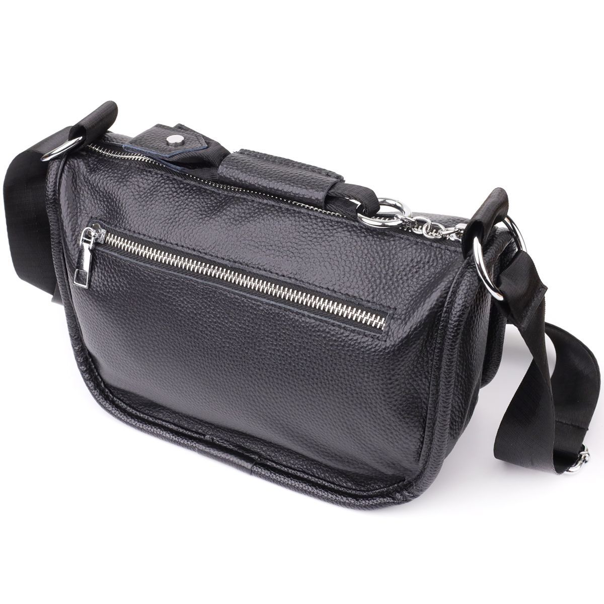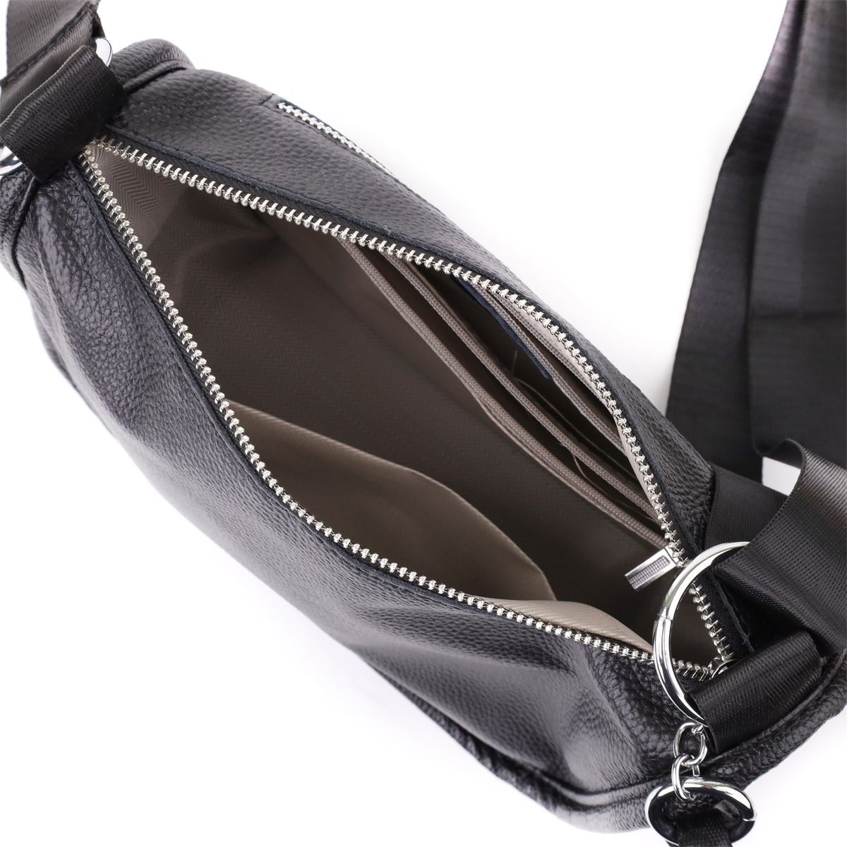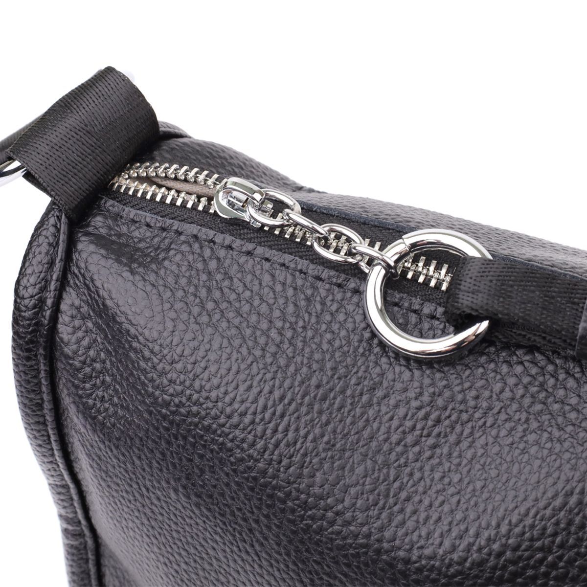 Жіноча шкіряна сумка e у чорному кольорі виконана з якісної зернистої шкіри та має напівкруглу акуратну форму, що підкреслює елегантність та сучасний стиль. Особливий акцент моделі - декоративний бігунок у вигляді стильного брелка, який додає індивідуальності та вишуканості. Сумка закривається на блискавку, всередині одне основне відділення з двома кишенями на блискавці та двома відкритими кишенями для дрібниць, на тильній стороні розташована зовнішня кишеня на блискавці. Текстильний ремінь не знімний та забезпечує зручне носіння, а фурнітура під срібло гармонійно доповнює загальний образ. Ця сумка стане універсальним аксесуаром для повсякденного використання та особливих випадків, поєднуючи практичність, стиль та увагу до деталей.