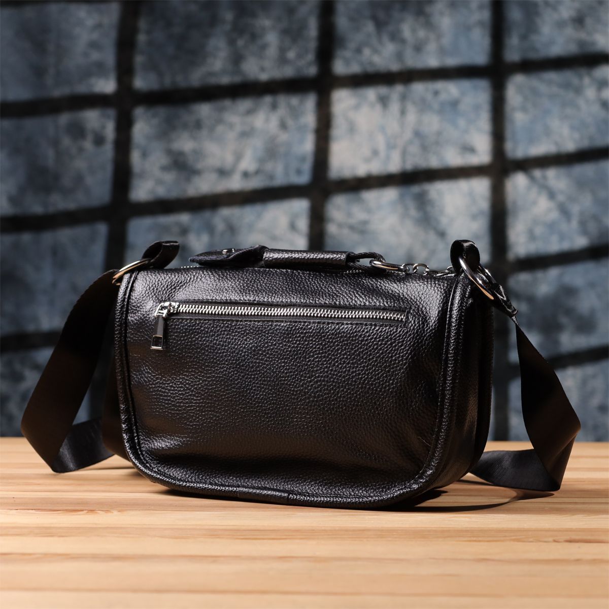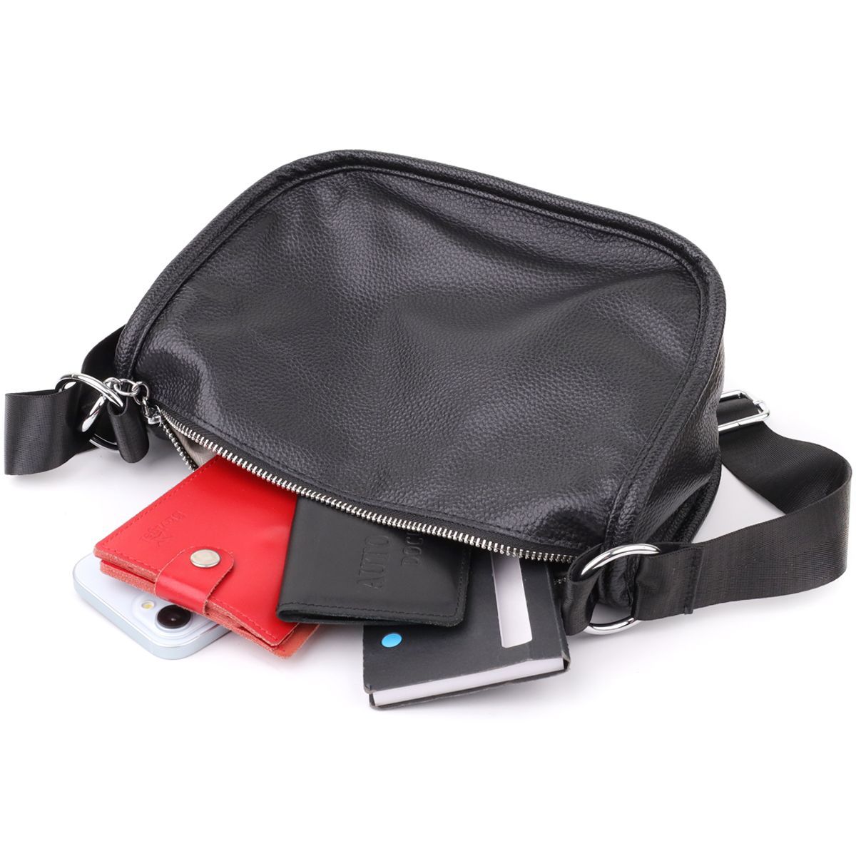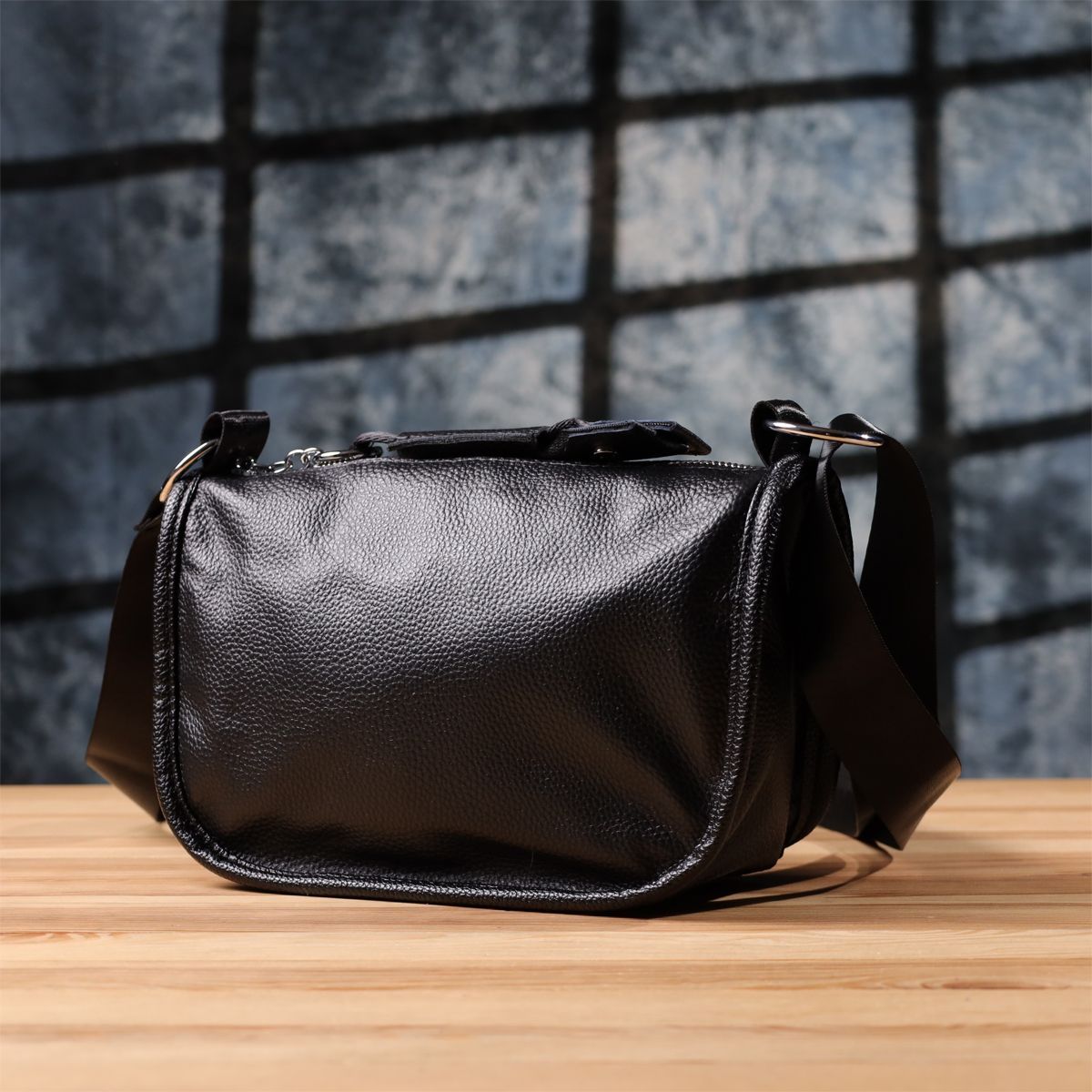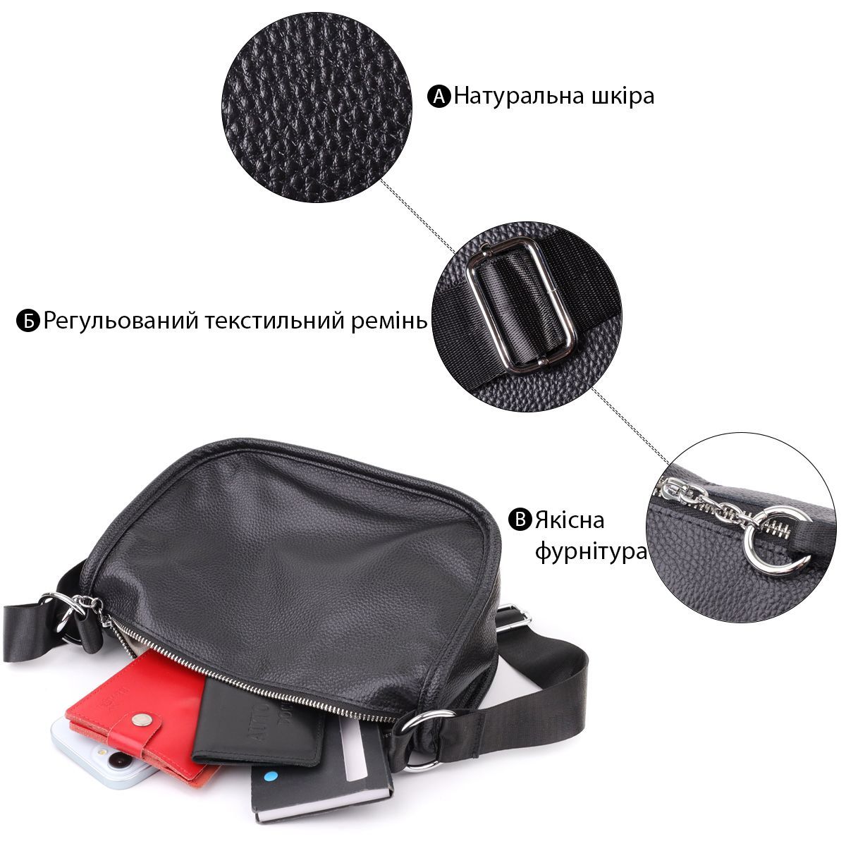Жіноча шкіряна сумка e у чорному кольорі виконана з якісної зернистої шкіри та має напівкруглу акуратну форму, що підкреслює елегантність та сучасний стиль. Особливий акцент моделі - декоративний бігунок у вигляді стильного брелка, який додає індивідуальності та вишуканості. Сумка закривається на блискавку, всередині одне основне відділення з двома кишенями на блискавці та двома відкритими кишенями для дрібниць, на тильній стороні розташована зовнішня кишеня на блискавці. Текстильний ремінь не знімний та забезпечує зручне носіння, а фурнітура під срібло гармонійно доповнює загальний образ. Ця сумка стане універсальним аксесуаром для повсякденного використання та особливих випадків, поєднуючи практичність, стиль та увагу до деталей.