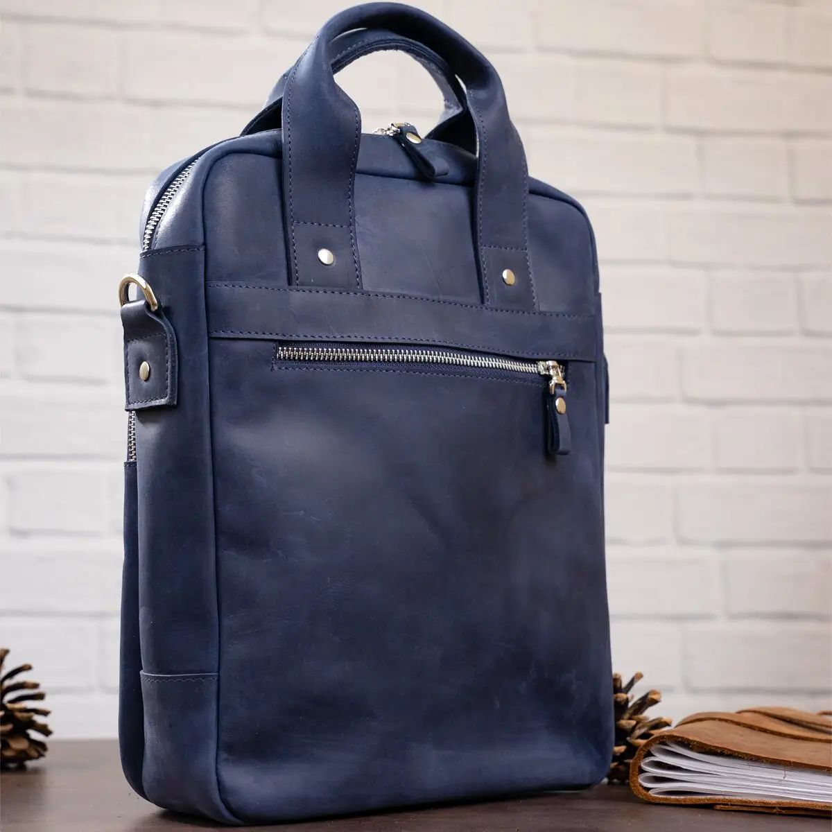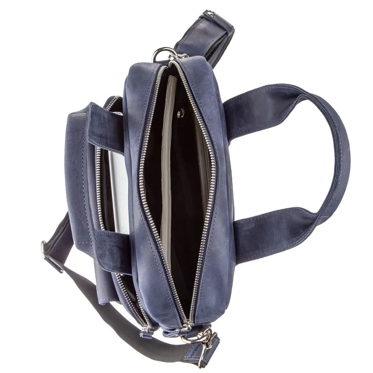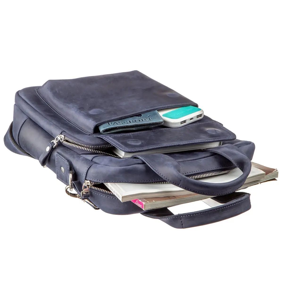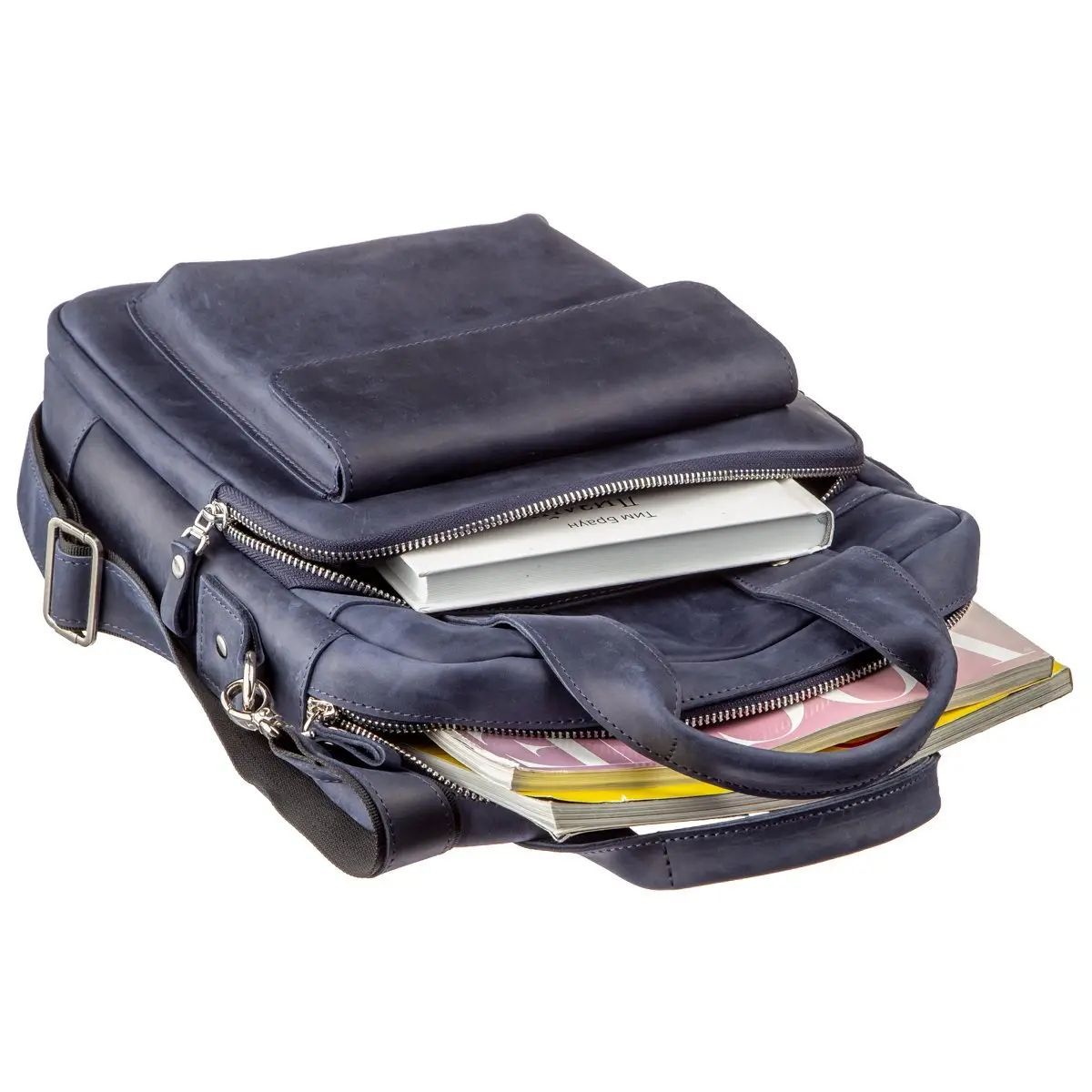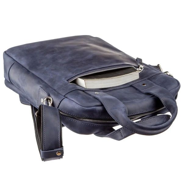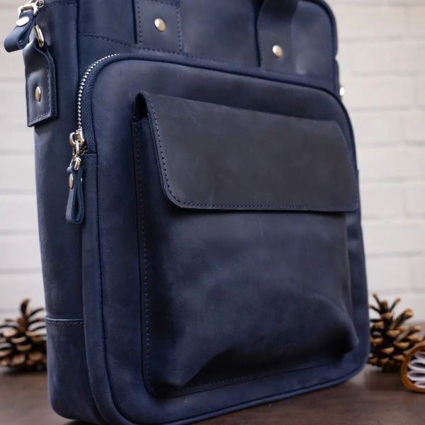 Выполненная из натуральной кожи синяя сумка от Shvigel будет отличным выбором на каждый день. Сумка содержит документы формата А4. Идеальный вариант для работы или встречи. Мы разработали эту модель для тех, кто любит качественные и в то же время оригинальные вещи. Синий цвет отлично подчеркнет ваш вкус и выделит вас из толпы среди серой массы. Сумка из натуральной кожи Crazy horse смотрится по винтажному. Впоследствии на сумке появляются царапины, создающие эффект старины, за который и любят этот тип кожи многие клиенты. Идеальный вариант как для обычного офисного работника, так и для солидного бизнесмена. Сумка подойдет практически к любому виду деятельности. Если вам понравилась эта модель, вы можете увидеть ее в различных типах кожи и цветах. Осталось только выбрать по своему вкусу, и ваша сумка прослужит вам далеко не один год.