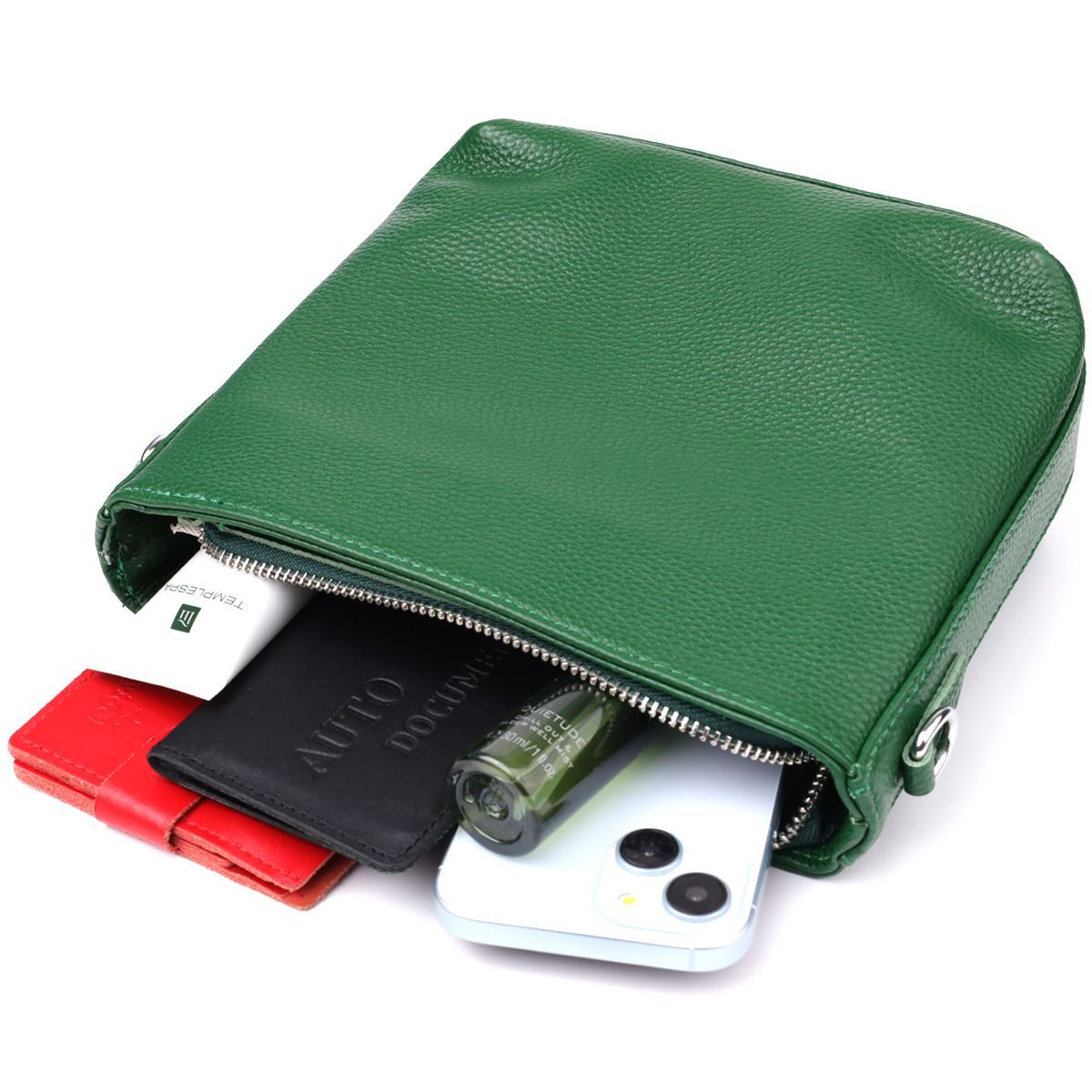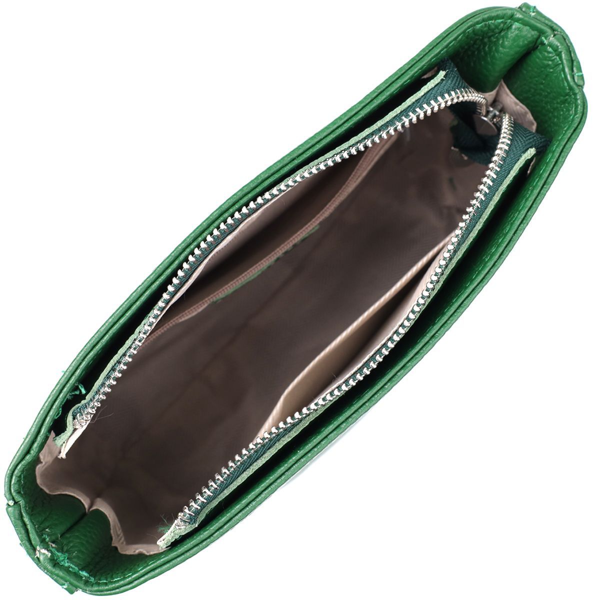 Оригінальна та стильна сумка з натуральної шкіри у насиченому зеленому кольорі – ефектний акцент у вашому повсякденному чи діловому образі. Модель оснащена одним основним відділенням, яке надійно закривається на блискавку. Усередині розташовані дві зручні кишені: потайна на блискавці для зберігання цінних дрібниць і відкрита кишеня — для предметів, до яких потрібен швидкий доступ.