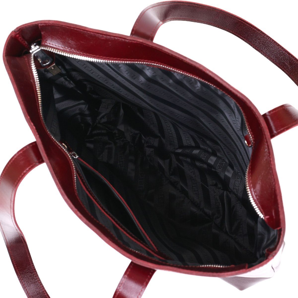 Великолепная вместительная женская сумка из плотной высококлассной натуральной кожи с отличными показателями износостойкости. Сумка имеет одно просторное отделение и небольшой потайной карман на молнии внутри. Закрывается также на молнию. Цвет изделия – насыщенный бордовый с легким переливом, фактура – гладкая и очень приятная на ощупь.