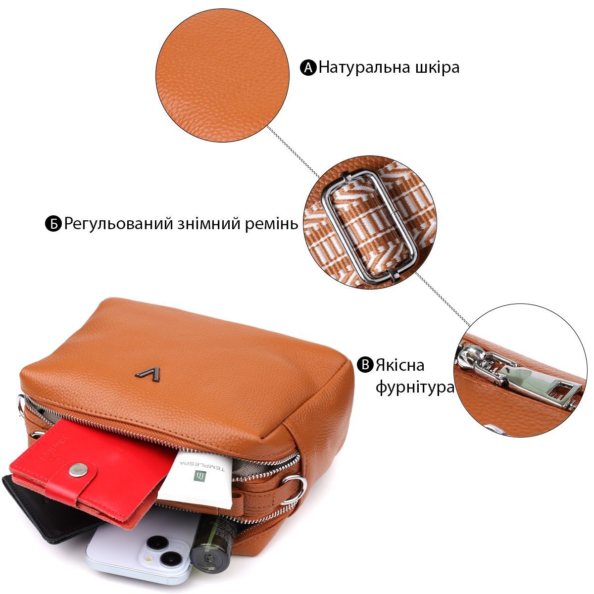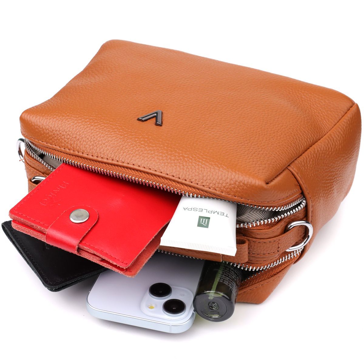 Сумка має два основні відділення на блискавці, що забезпечує зручну організацію простору. Усередині розташована потайна кишеня на блискавці - відмінне рішення для зберігання дрібниць та необхідних предметів.