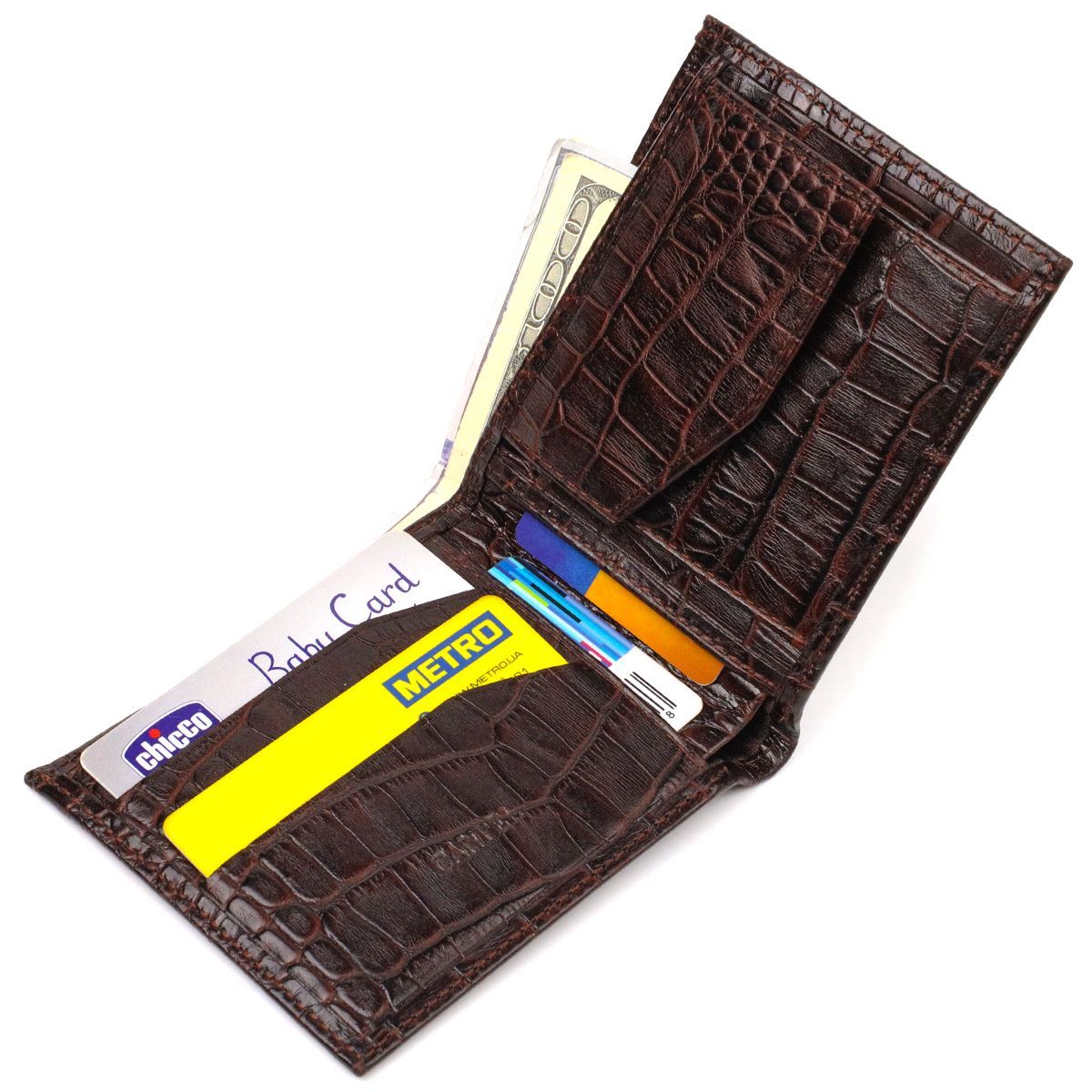 Прекрасный мужской кошелек из натуральной кожи, с тиснением под крокодила. Аксессуар имеет одно основное отделение с тканевой перегородкой в которое помещаются купюры всех номиналов, три кармана для карточек, два близлежащих кармана и монетницу. Закрывается аксессуар пополам, без застежки. На лицевой стороне, в правом нижнем углу – металлический логотип компании производителя. Покупая кожаный аксессуар этой фирмы, себе или в подарок, будьте уверены, что он прослужит Вам не один год.