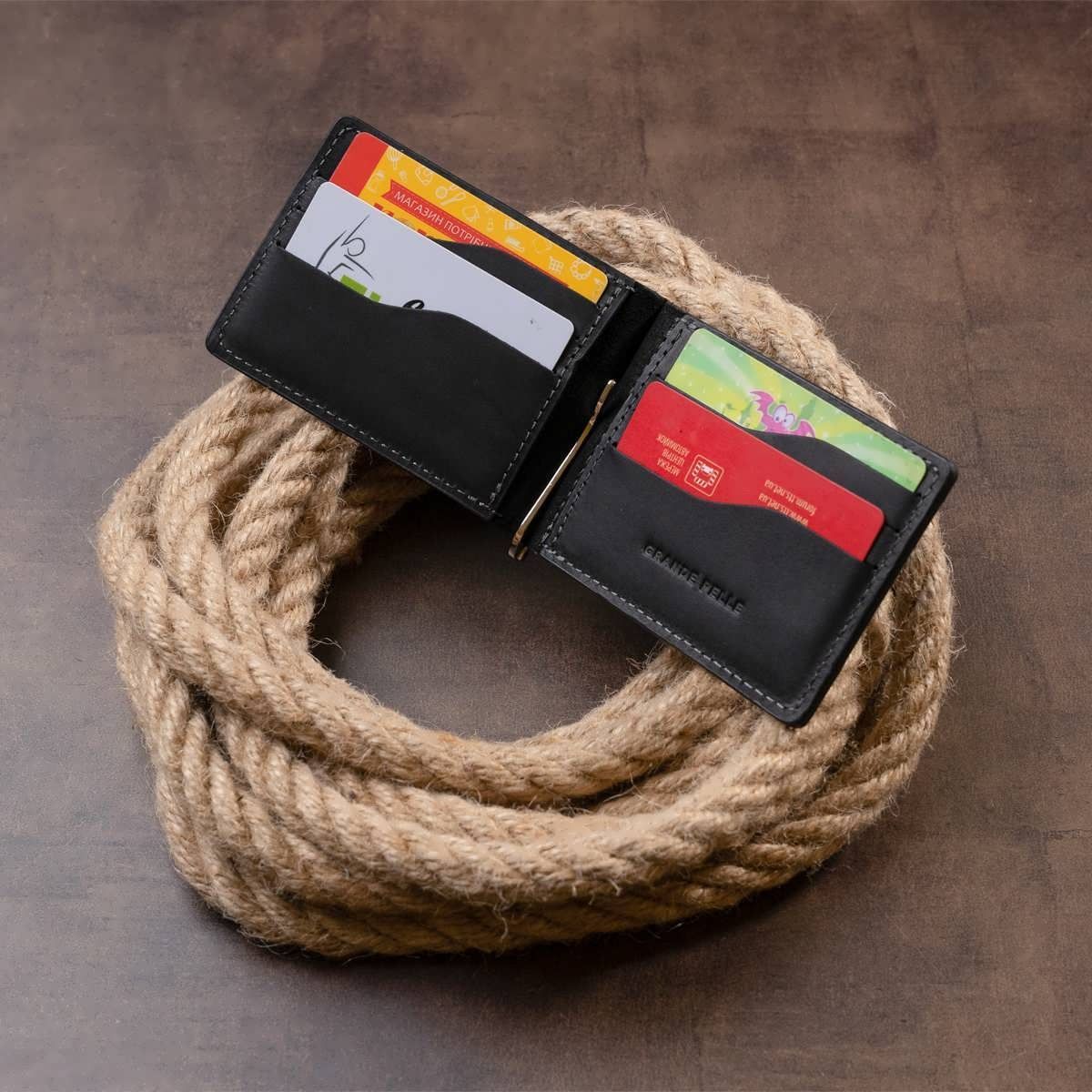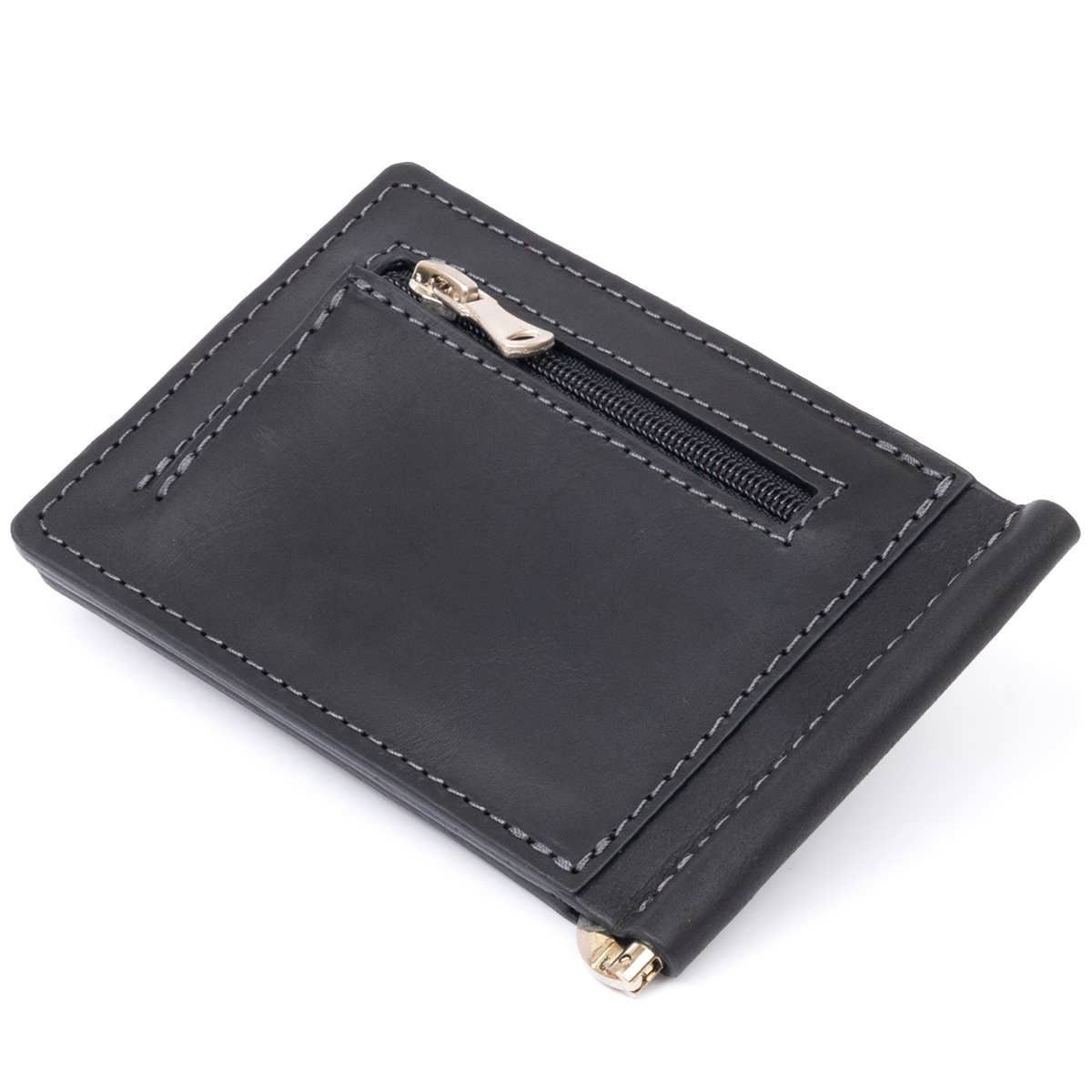Кожаный портмоне минимального размера со всем необходимым функционалом. Портмоне дополнено зажимом для купюр из крепкого металла. Современный клиент пытается подбирать максимально компактные аксессуары и носить с собой минимум вещей. Именно поэтому наш портмоне с зажимом станет идеальным вариантом для вашего повседневного аксессуара. Изделие без застежки. Портмоне имеет маленький карманчик для мелочи на тыльной стороне. В комплекте к зажиму идет войлочный чехол. Таким образом, аксессуар станет идеальным подарком для ваших близких.