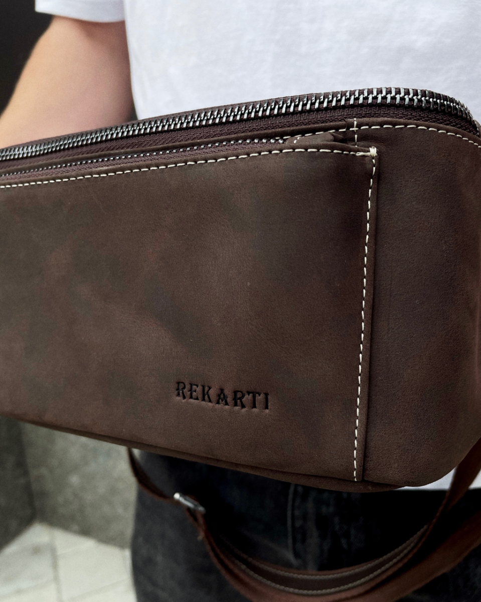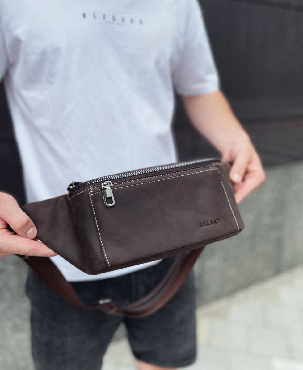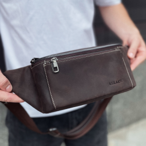 Стильна поясна сумка з натуральної шкіри — чудове придбання для практичного чоловіка. Головне відділення закривається на блискавку. Внутрішня підкладка виготовлена з міцного текстильного матеріалу та зворотного боку шкіри. Сумка має багато функціональних кишень на блискавці: 1 - з лицьового боку, 1 — з тильного боку. Пояс тканинний, а застібка на поясі виготовлена з високотехнологічного пластику.
