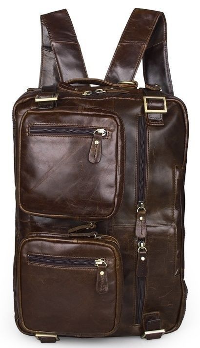 Эксклюзивная сумка-трансформер из натуральной винтажной кожи коричневого цвета. Аксессуар очень удобен, практичный и функциональный. Такая сумка, безусловно, должна понравиться современному человеку. Аксессуар имеет множество карманов, его можно носить в руке через плечо, а также как рюкзак.