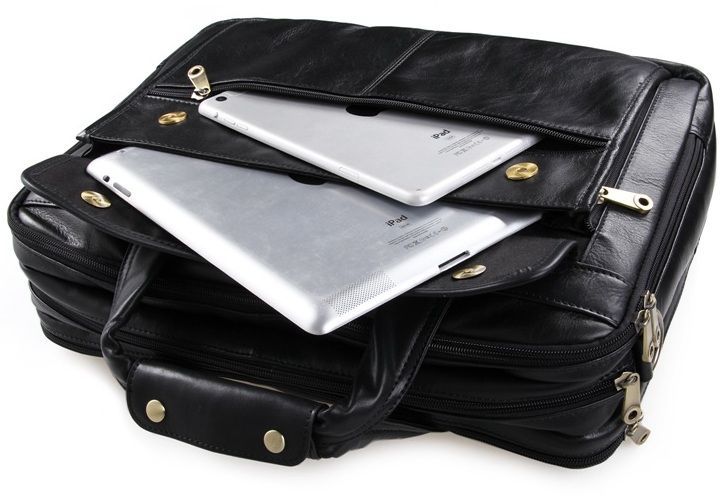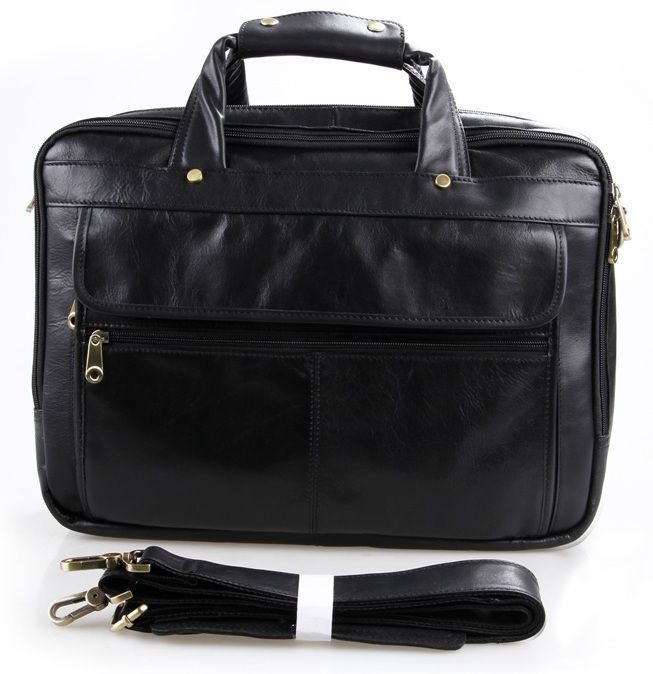 Вместительная мужская многофункциональная сумка для ноутбука. Аксессуар выполнен из гладкой натуральной кожи приятной на ощупь. Цвет фурнитуры латунь. На лицевой стороне изделия расположен накладной карман под клапаном и небольшое отделение на молнии. На задней стороне находится карман на молнии. Подкладка выполнена из прочного текстильного черного цвета. Сумку можно переносить в руке (ручки кожаные) или через плечо (в комплекте съемный, регулируемый плечевой ремень).