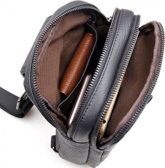 На лицевой стороне аксессуара расположен накладной карман, который застегивается змейкой, на задней наружной стенке прорезной карман на застежке.