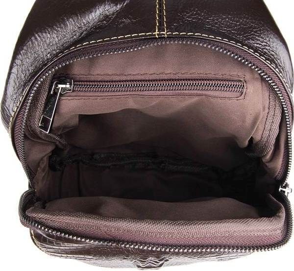 Оригинальная кожаная сумка-рюкзак коричневого цвета, из натуральной кожи, которую можно в равной степени, как мужчинам, так и женщинам. Цвет фурнитуры латунь. На лицевой стороне расположен накладной карман, закрывающийся на молнию и клапан на магните. Оригинальность этой модели придает клапан, изготовленный из натуральной кожи с фактурой под крокодила. На задней внешней стороне данной модели находится один вертикальный карман на молнии. Аксессуар имеет одно основное отделение на молнии, в котором находится один скрытый карман на змейке. Подкладка выполнена из крепкого текстильного материала коричневого цвета. Аксессуар поставляется в текстильном чехле пыли белого цвета.