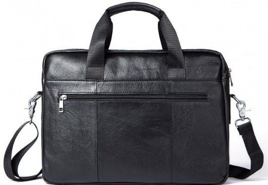 Вместительная сумка с отделением для небольшого ноутбука 15 ", а также документов формата А4. Аксессуар выполнен из натуральной зернистой кожи черного цвета. На лицевой стороне данного изделия расположено одно отделение и два кармана на металлических молниях. На задней стороне находится еще одно отделение на молнии". также через плечо (в комплекте съемный, регулируемый плечевой ремень, выполненный из текстильного материала). Цвет фурнитуры: серебро.