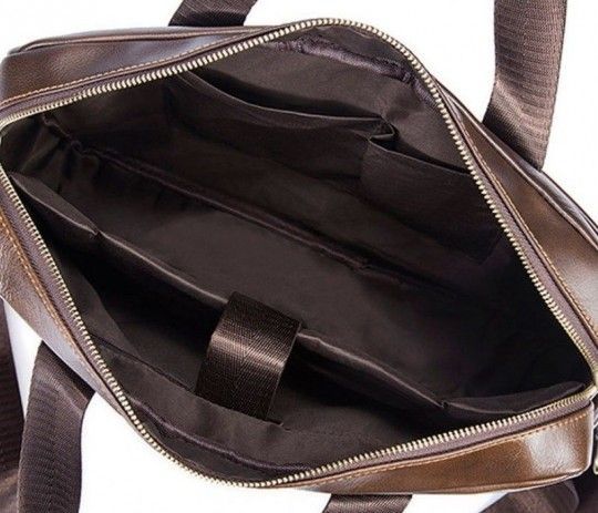 Коричневая многофункциональная мужская сумка с отделением для небольшого ноутбука 15", а также документов формата А4. Аксессуар выполнен из натуральной зернистой кожи коричневого цвета. На лицевой стороне данного изделия расположено одно отделение и два кармана на металлических молниях. На задней стороне находится еще одно отделение на молнии. кожаных ручек, а также через плечо (в комплекте съемный, регулируемый плечевой ремень, выполненный из текстильного материала).