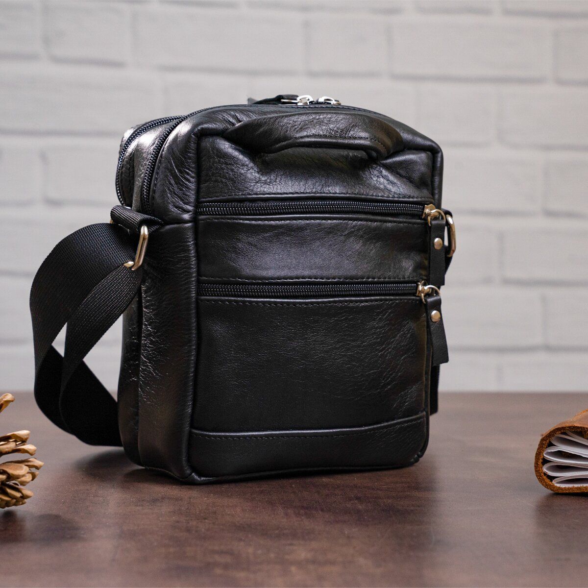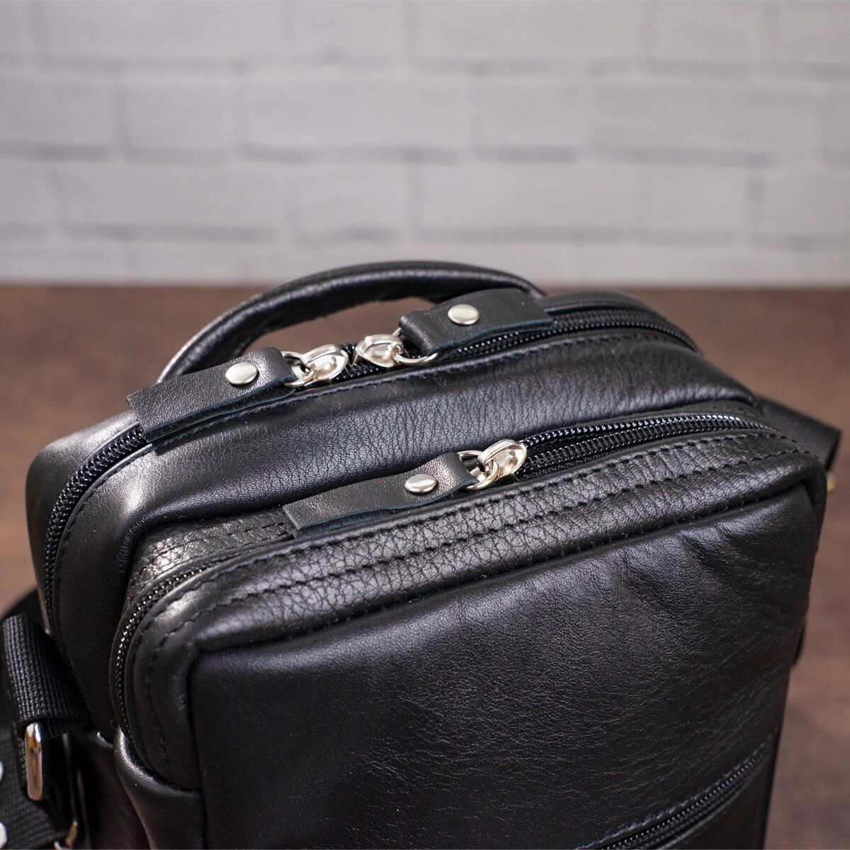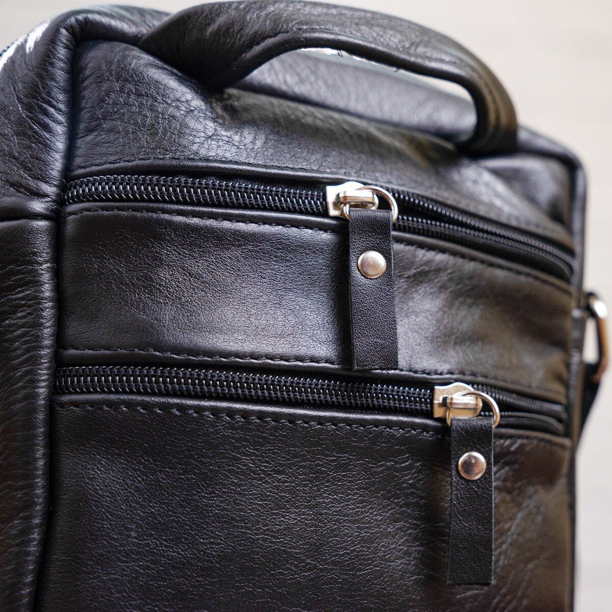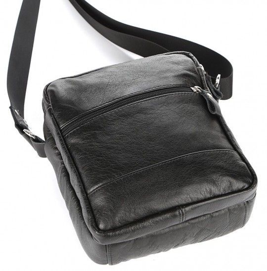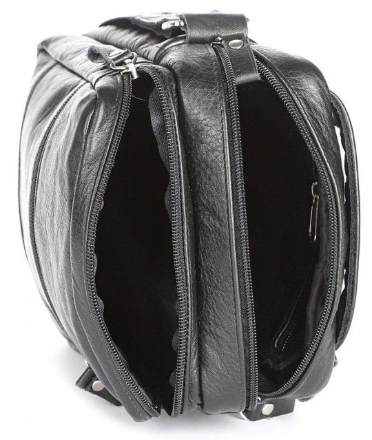 Небольшая мужская кожаная сумка для автомобилистов. Несмотря на свои компактные размеры, аксессуар очень вместительный и функциональный. Цвет фурнитуры: серебро. Сумку можно носить через плечо и в руке. На лицевой стороне расположено отделение на молнии. На задней наружной стороне находятся два небольших отделения на молниях. Сумка имеет сразу два автономных отделения на молниях. В одном из этих отделений находится тайный карман на молнии.