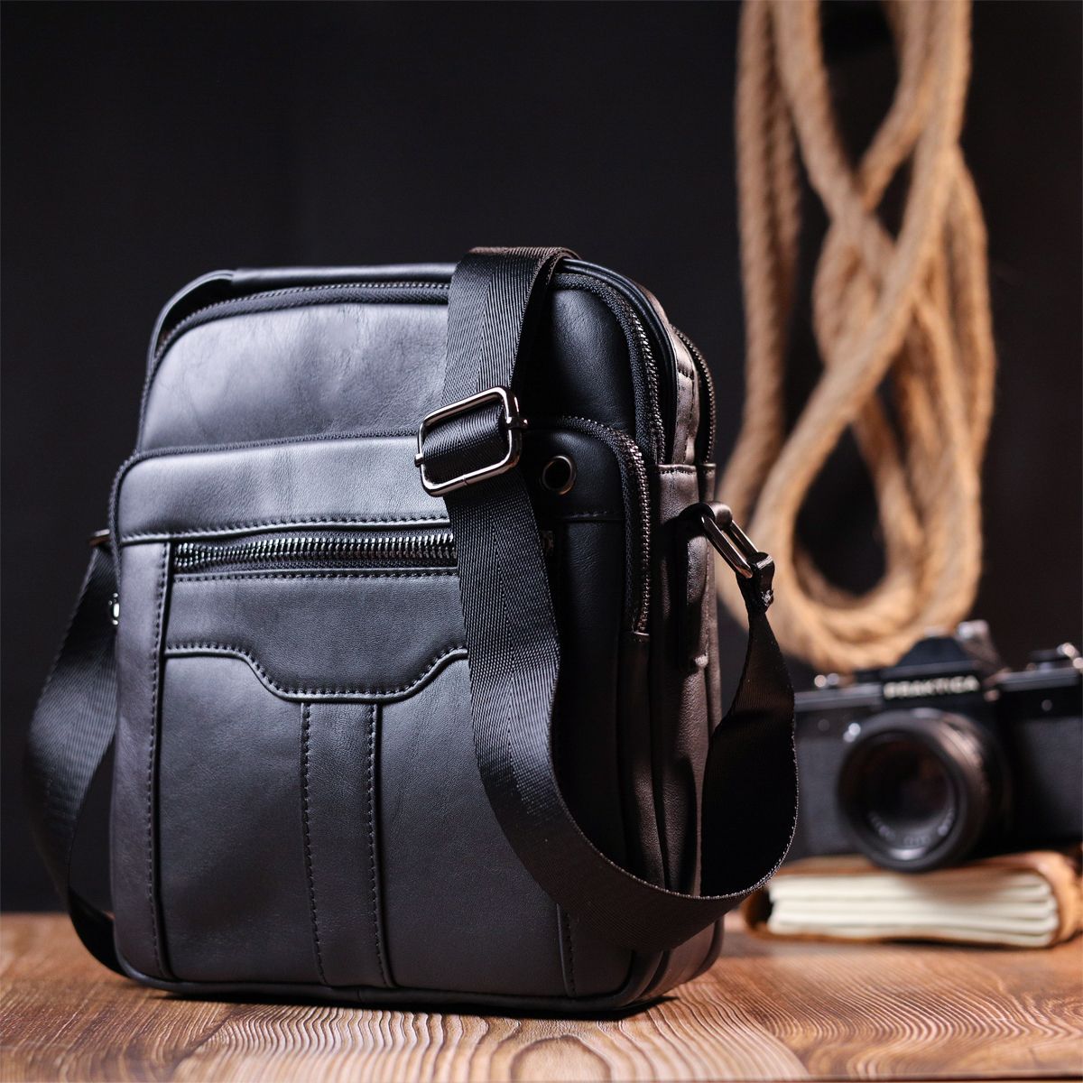 Практичная мужская сумка компактного размера из натуральной кожи. В сумку с легкостью поместятся все нужные вещи. С такой сумкой удобно ходить на работу или на встречи. Дополнено изделие качественной фурнитурой. Сумка станет отличным подарком для близкого человека.