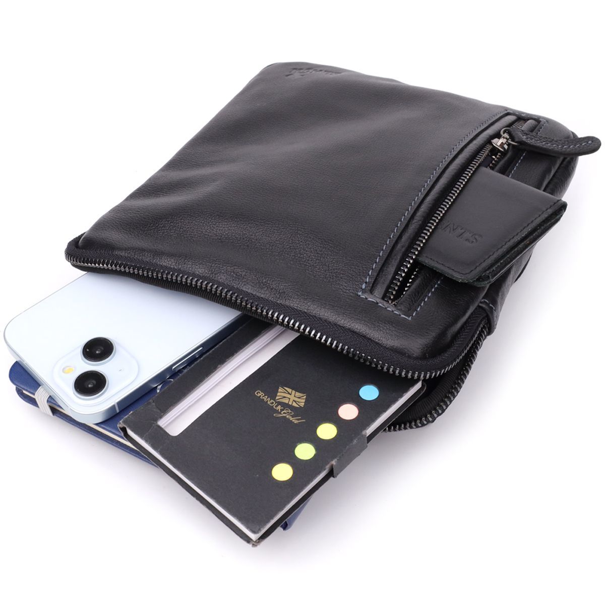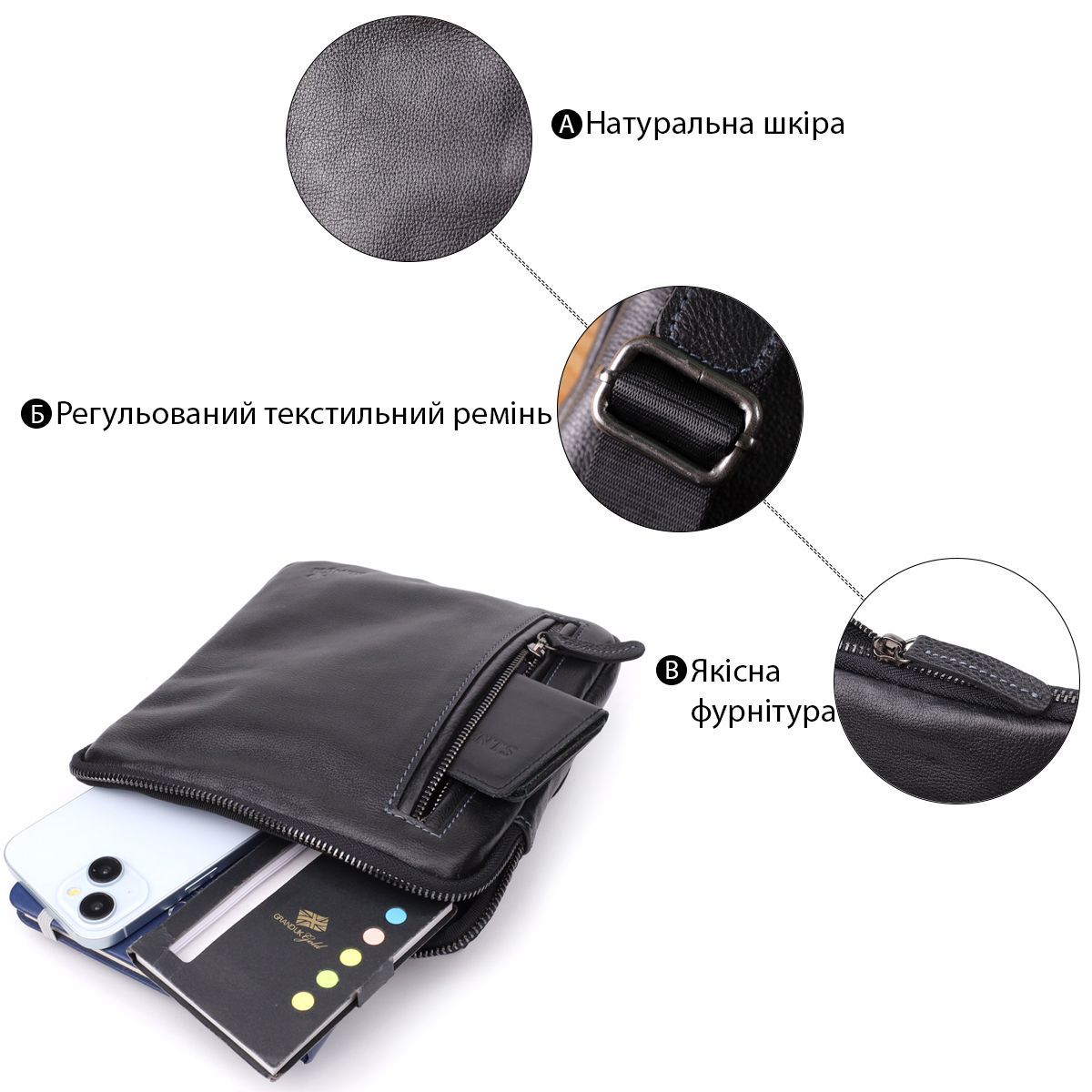 Ця чоловіча вертикальна сумка виготовлена з натуральної зернистої шкіри класичного чорного кольору. Завдяки міцній текстурі та акуратній обробці аксесуар виглядає стильно та універсально, легко поєднуючись із діловим та повсякденним чином.