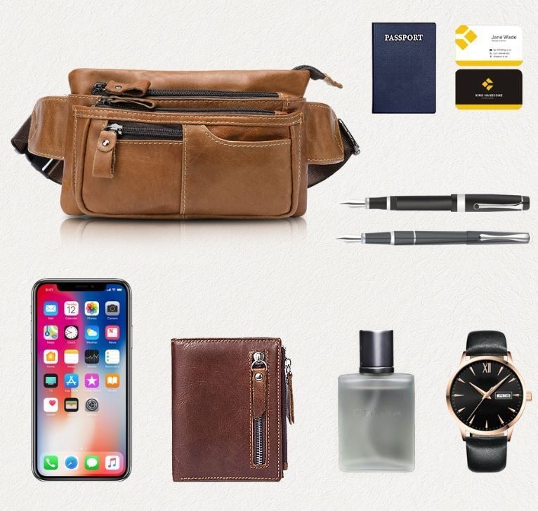 Сумка на пояс с простым, непринужденным дизайном. Поясные сумки пользуются огромной популярностью у мужчин. С такой сумкой все самое важное будет всегда под рукой. А украсть сумку из пояса будет гораздо сложнее. Поэтому с такой бананкой вы будете чувствовать себя безопаснее. Также с ней удобно ездить в транспорте или брать его на дальние поездки. Хороший вариант – малогабаритный, но достаточно вместительный. Вам будет легко из такой сумки получить документы или деньги при необходимости. Модель прошита рыжей строчкой и дополнена фурнитурой серебристого цвета. Будет хорошо смотреться как подарок для близкого человека.