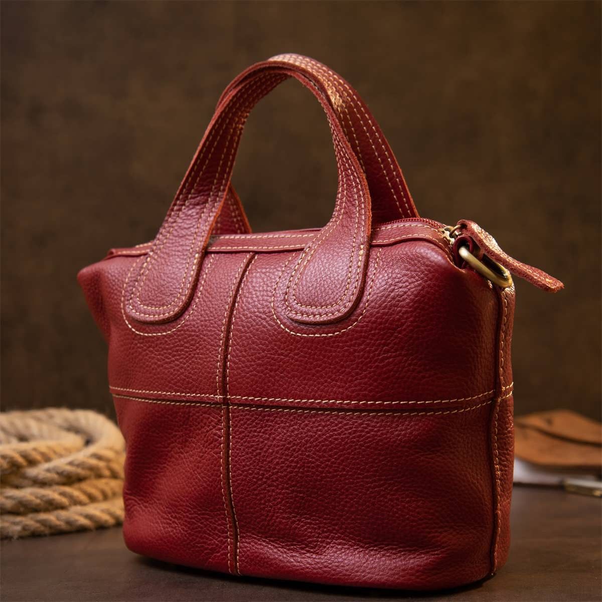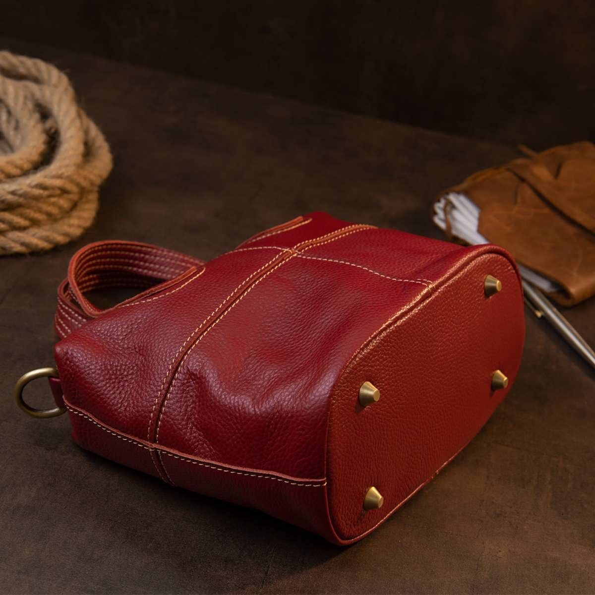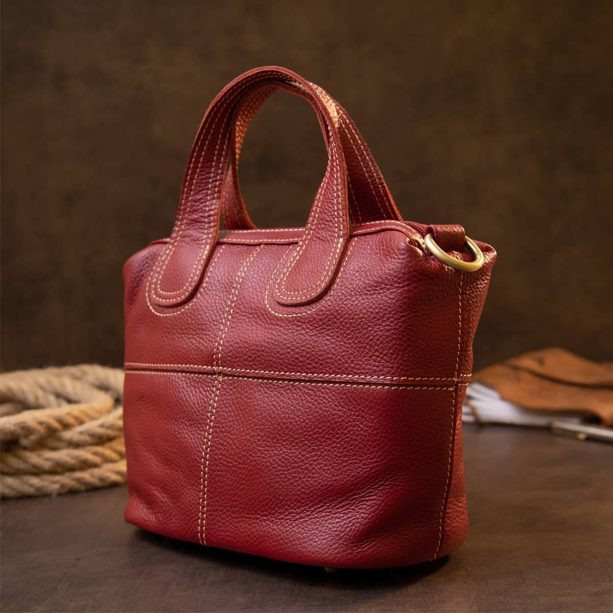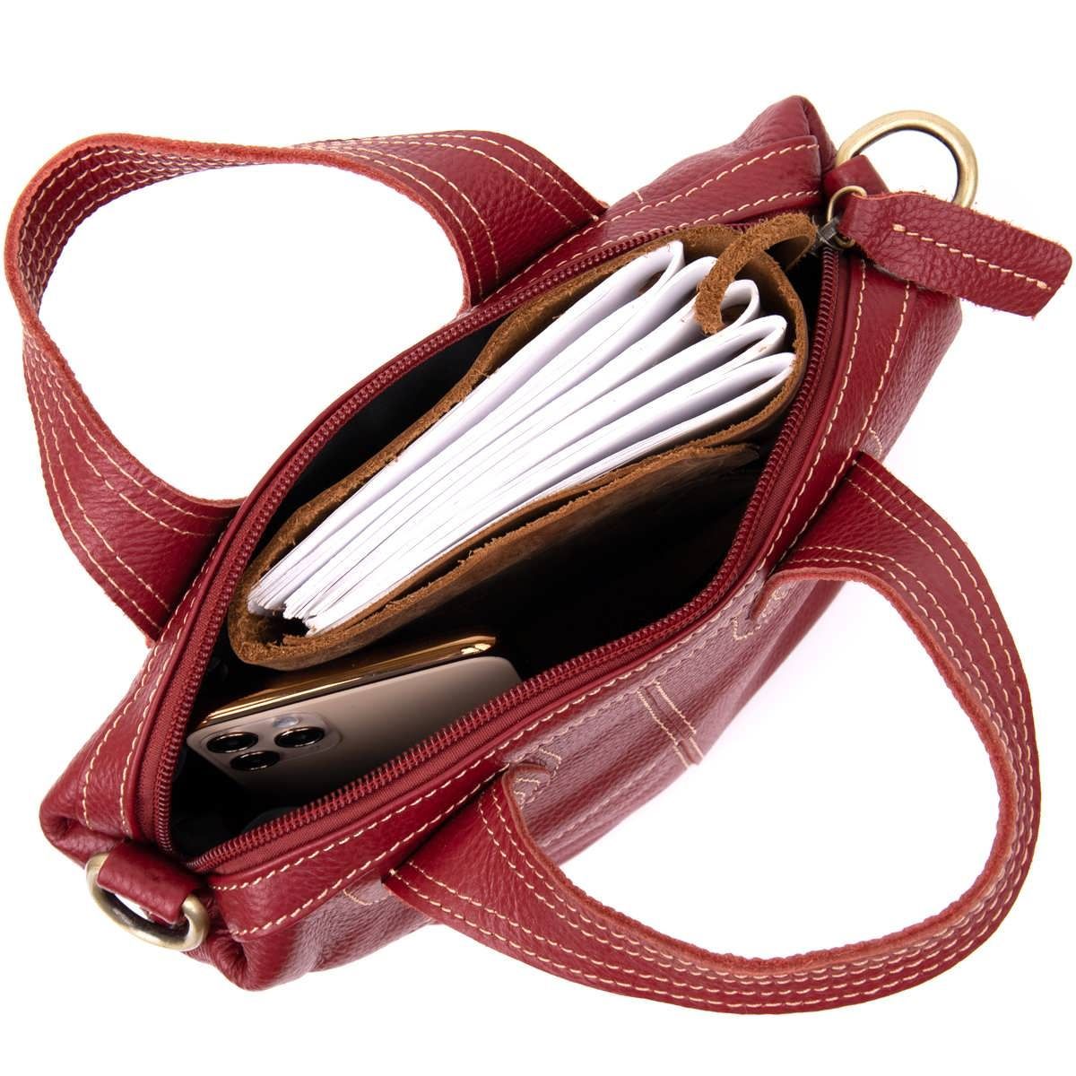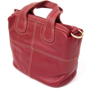 Компактная женская сумка из натуральной кожи со светлой нитью в дизайне. Сумка для ярких и уверенных личностей. Модель в красном и насыщенном красном цвете. Изделие в коже флотарь, которая совсем неприхотлива в уходе. Внизу сумки металлические вставки для защиты днища сумки. Сумка имеет весь нужный функционал. Изделие подойдет как для каждого дня, так и для вечернего образа. Сумку можно носить в руках и с помощью съемного ремешка – на плече. Кожаная сумка – самый лучший подарок для любой девушки.