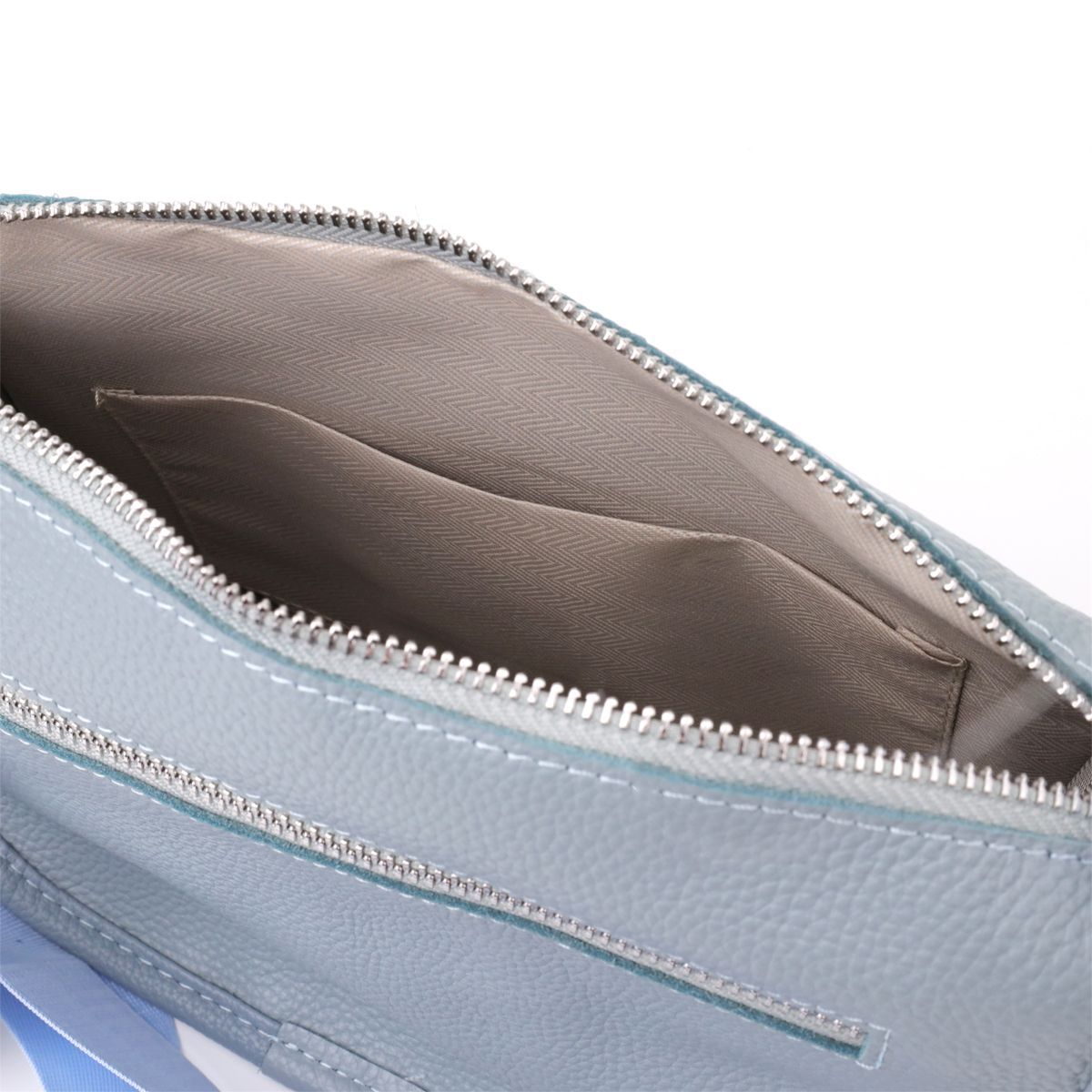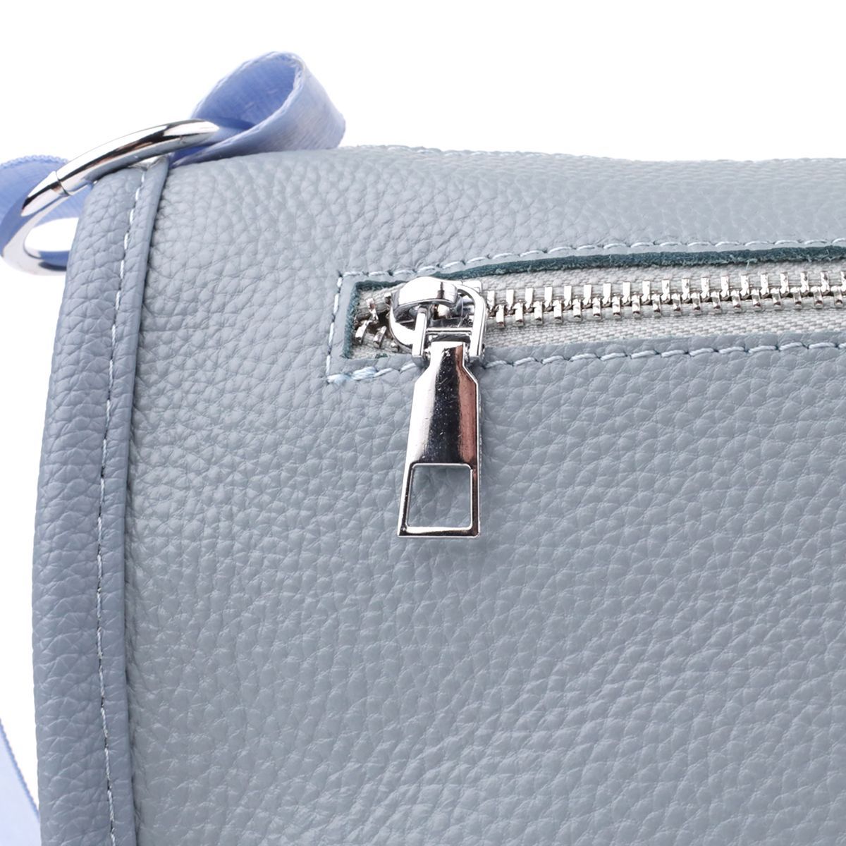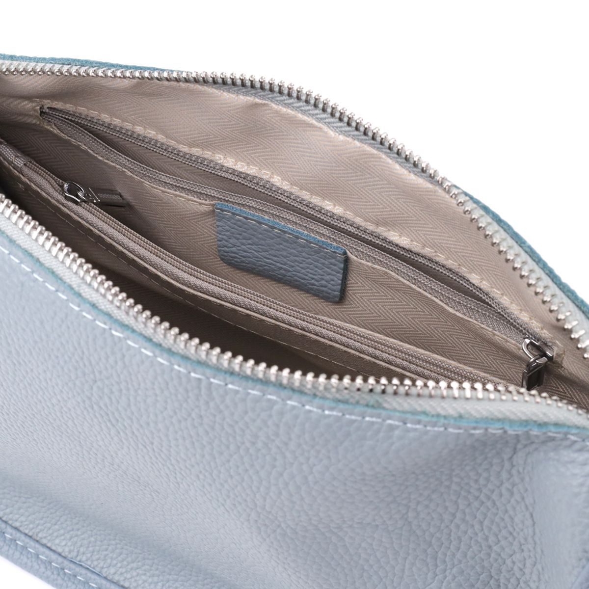 Жіноча шкіряна сумка у сіро-блакитному кольорі виконана з якісної зернистої шкіри та має напівкруглу акуратну форму, що підкреслює сучасний та елегантний стиль. Особливий акцент моделі - декоративний бігунок у вигляді стильного брелка, який додає індивідуальності та вишуканості. Сумка закривається на блискавку, всередині розташоване основне відділення із двома кишенями на блискавці та двома відкритими кишенями для дрібниць, на тильній стороні є зовнішня кишеня на блискавці. Незнімний текстильний ремінь забезпечує комфортне носіння, а фурнітура під срібло гармонійно відтіняє холодний сіро-блакитний тон шкіри. Ця сумка стане універсальним аксесуаром для повсякденного використання та особливих випадків, поєднуючи практичність та стиль.