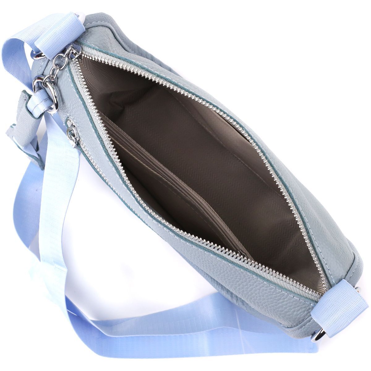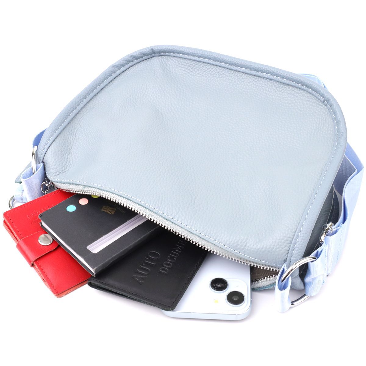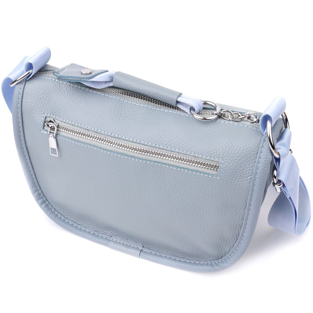 Жіноча шкіряна сумка у сіро-блакитному кольорі виконана з якісної зернистої шкіри та має напівкруглу акуратну форму, що підкреслює сучасний та елегантний стиль. Особливий акцент моделі - декоративний бігунок у вигляді стильного брелка, який додає індивідуальності та вишуканості. Сумка закривається на блискавку, всередині розташоване основне відділення із двома кишенями на блискавці та двома відкритими кишенями для дрібниць, на тильній стороні є зовнішня кишеня на блискавці. Незнімний текстильний ремінь забезпечує комфортне носіння, а фурнітура під срібло гармонійно відтіняє холодний сіро-блакитний тон шкіри. Ця сумка стане універсальним аксесуаром для повсякденного використання та особливих випадків, поєднуючи практичність та стиль.
