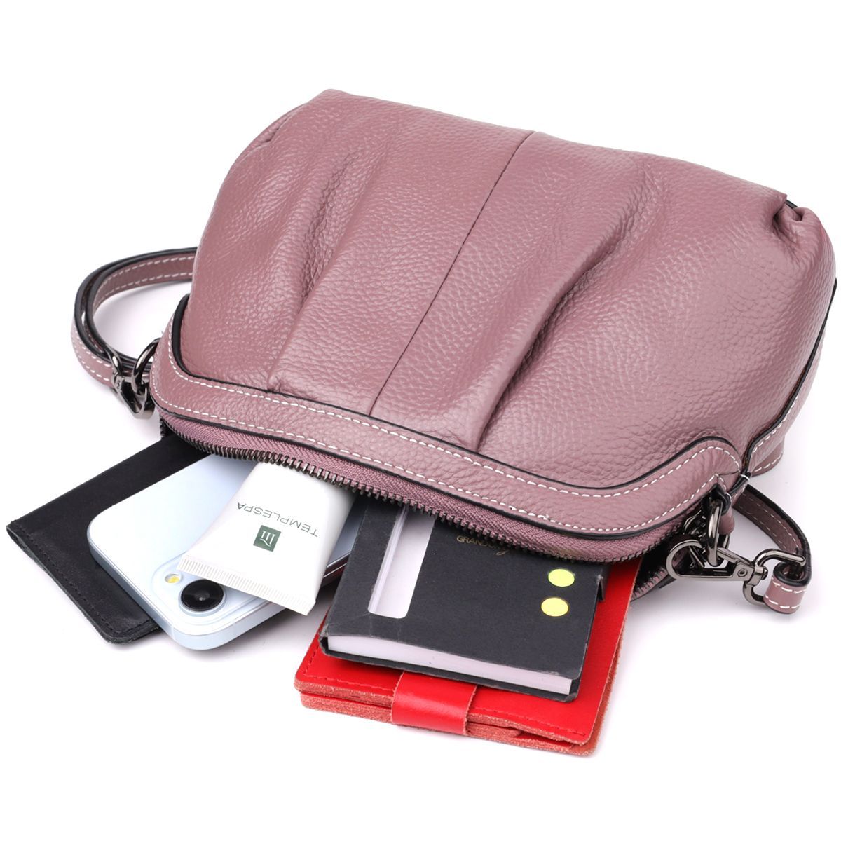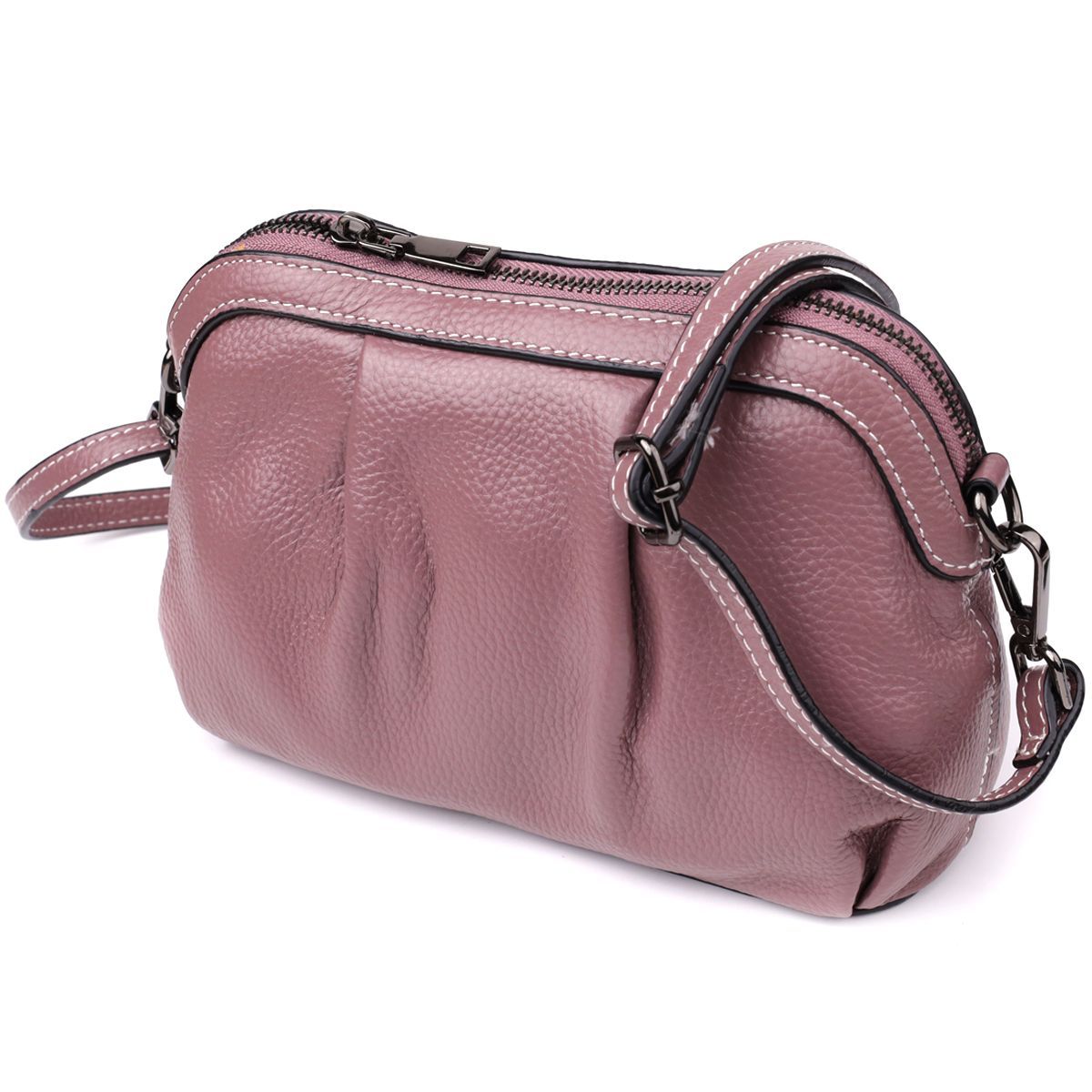 Пурпурна шкіряна сумка з драпіруванням - це аксесуар з характером: вишуканий, помітний і водночас практичний. Ідеально підійде як для буднів, так і для особливих випадків, коли хочеться виглядати особливо ефектно.