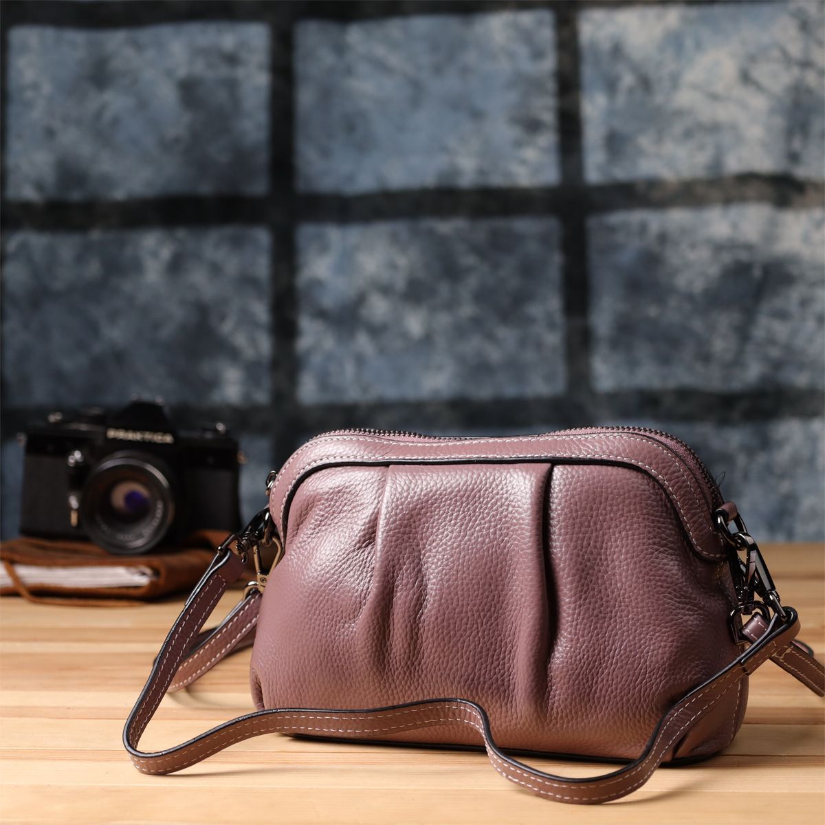 Яскрава та витончена пурпурна шкіряна сумка з елегантним драпіруванням – це ефектний аксесуар для тих, хто хоче підкреслити індивідуальність та впевнений стиль. М'які складки на лицьовій частині надають виробу візуального обсягу та плавних ліній, підкреслюючи натуральну текстуру шкіри. Глибокий пурпуровий відтінок додає виразності та шляхетності, роблячи сумку справжнім акцентом у будь-якому образі.