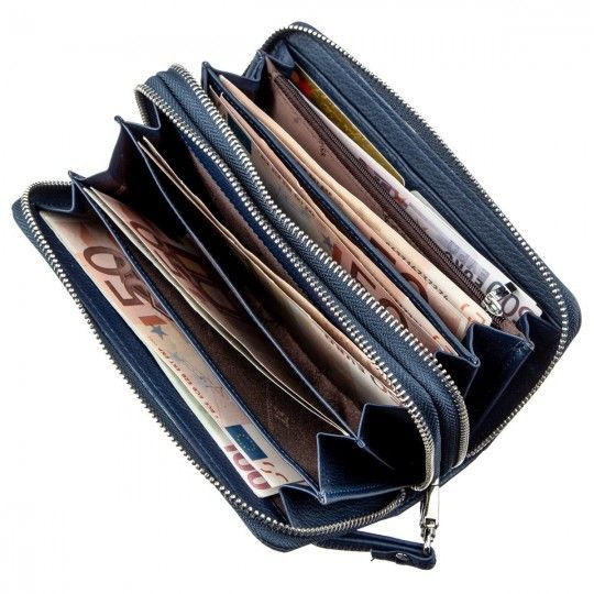 Жіночий клатч із високоякісної шкіри для ділових та впевнених у собі дам. Має красивий та стильний дизайн, дуже місткий та практичний. Колір – синій із матовим відтінком. Має два абсолютно автономні відділення, які закриваються на масивну блискавку срібного кольору. Усередині є шість великих відділень на всю довжину гаманця, відділення на блискавці для цінних та дрібних речей, кишені для карток та візиток. Якщо Ви захочете носити клатч окремо, а не в сумці, то для цього передбачено спеціальний ремінець на зап'ясті. Запакований гаманець у білу картонну коробку з логотипом виробника.