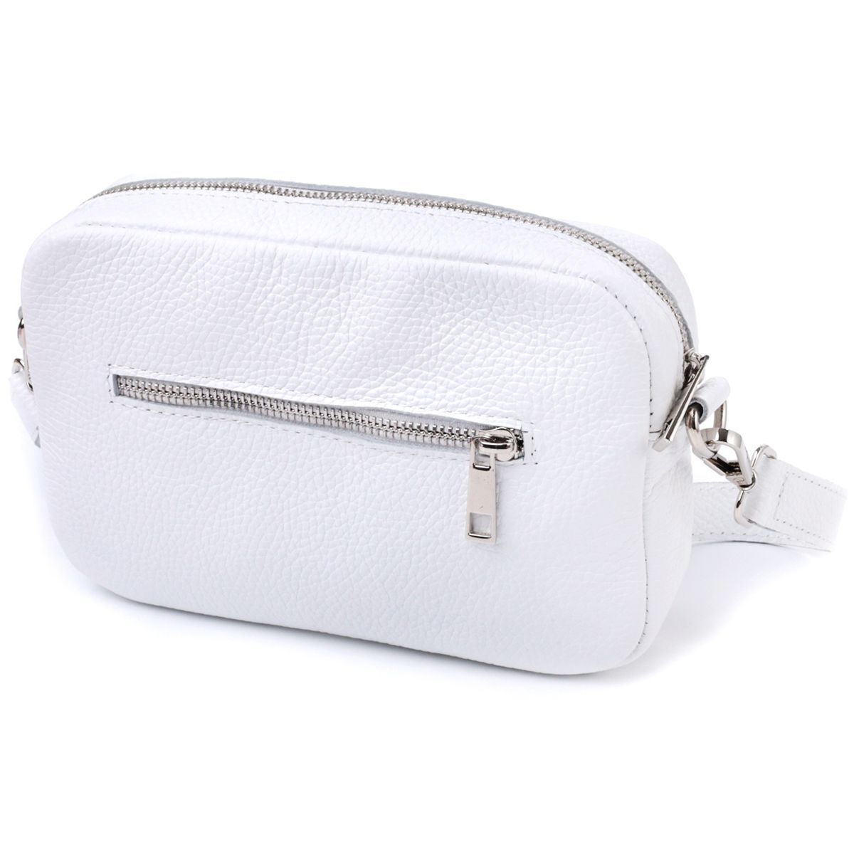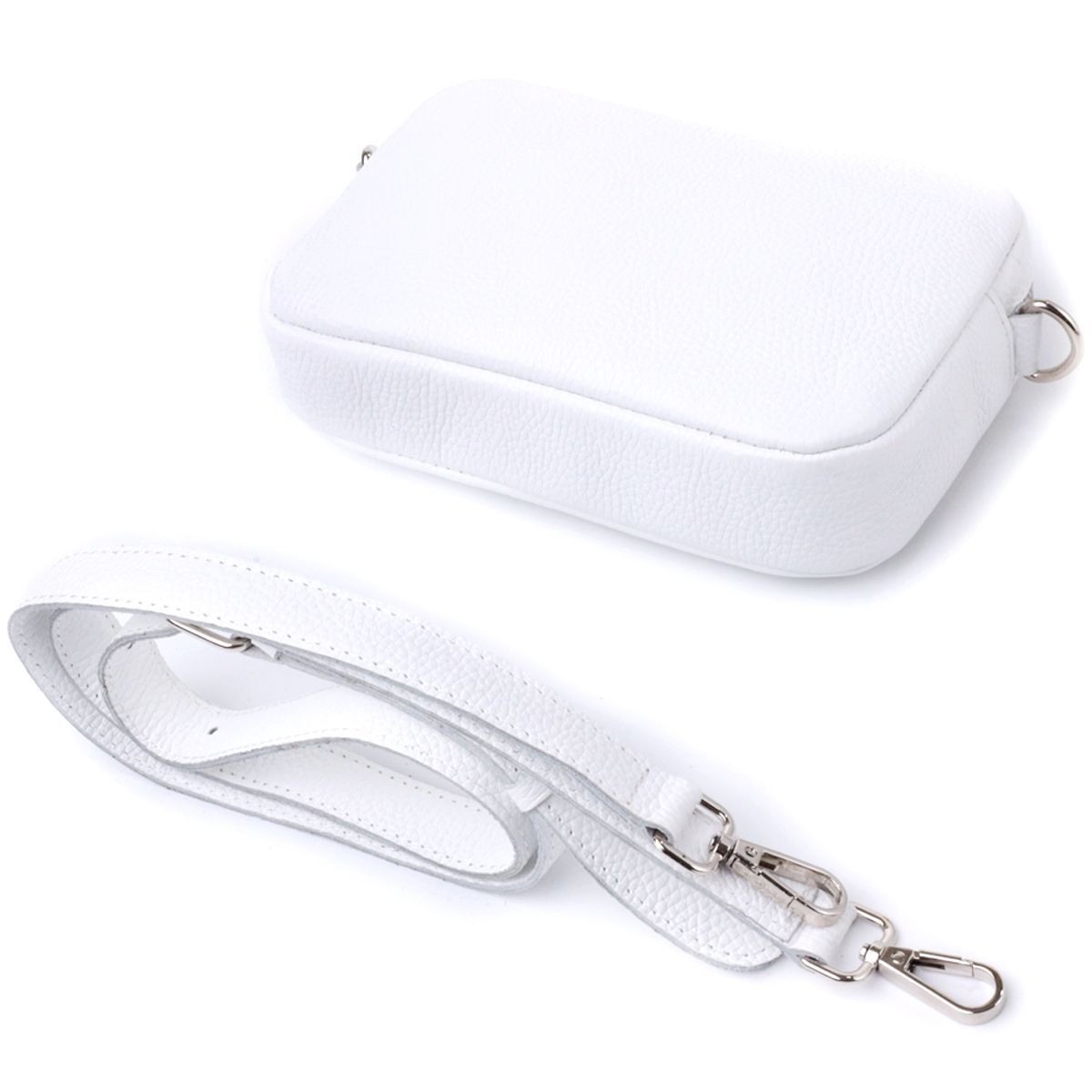 Стильна жіноча сумка, яку можна носити через плече як крос-боді, на плечі і як клатч в руках, для цього ремінець легко відстібається. Виріб виконаний у стильному білому кольорі із зернистої натуральної шкіри стійкою до подряпин. Шкіра м'яка, приємна на дотик із високими показниками зносостійкості. Відмінний варіант як кожного дня, так і на вечір. Сумка добре тримає форму, має міцну підкладку, фурнітура срібного кольору – стійка не змінює свій колір у процесі носіння. Аксесуар чудово поєднується з усіма стилями в одязі та може стати чудовим подарунком на будь-яке свято.