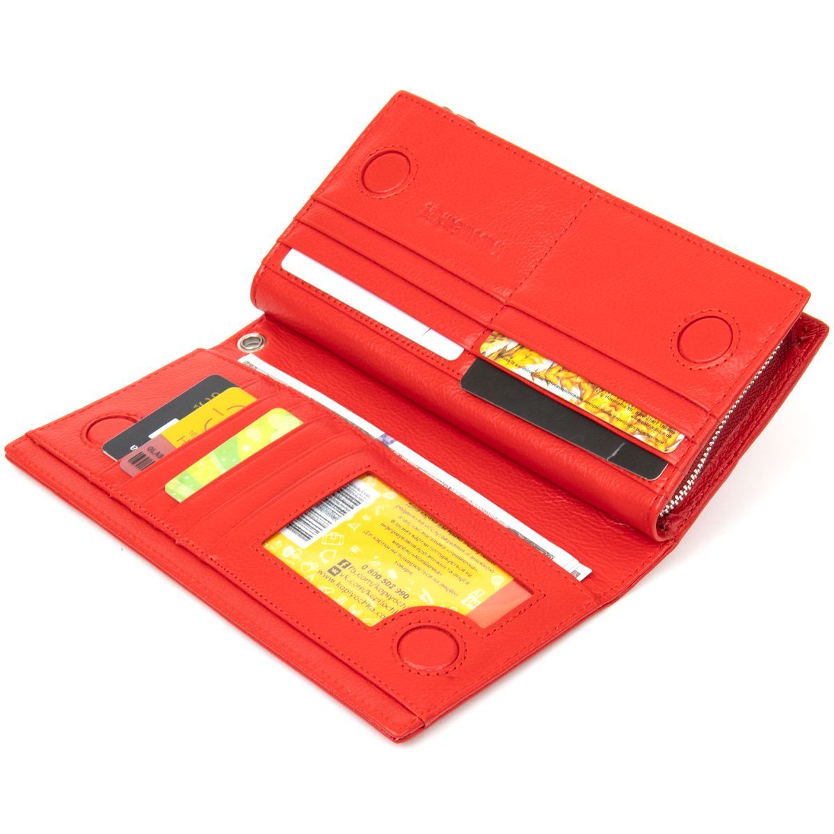 Женский кожаный кошелек в классическом и практичном дизайне. Имеет красивый красный насыщенный цвет и зернистую матовую фактуру кожи. Внутри разместились удобные отделения для купюр, монет, слоты для карт и другие карманы. Изготовлено изделие очень качественно и надежно. Этот аксессуар станет отличным подарком для родного человека на любой праздник.