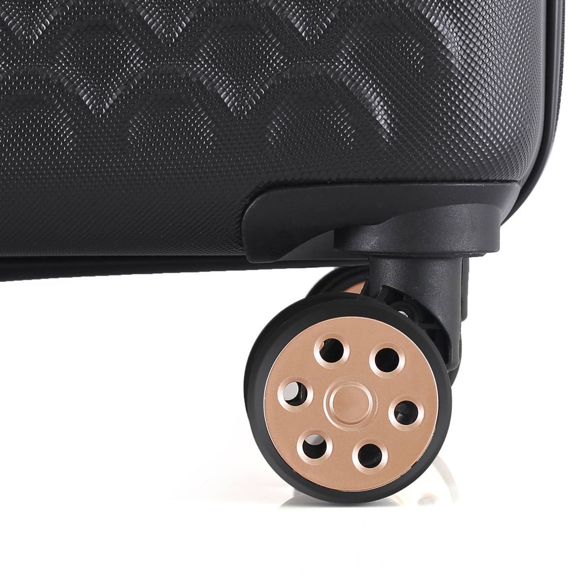 - Повноповоротні колеса - дана модель оснащена чотирма обертовими на 360 ° здвоєними колесами. Здвоєні колеса забезпечують кращий розподіл ваги та стійкість валізи, відмінне зчеплення, маневреність та мають більшу зносостійкість. Колеса кріпляться на 4 гвинти зсередини, що забезпечує високу стійкість при ударному навантаженні з будь-якого боку і дозволяє їх замінити у разі зносу.