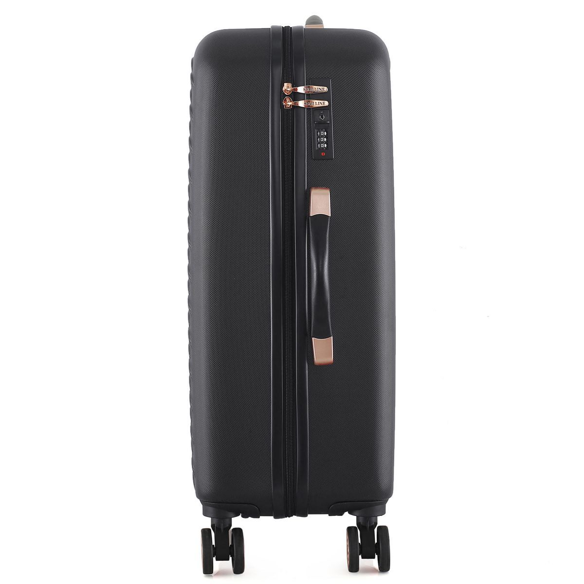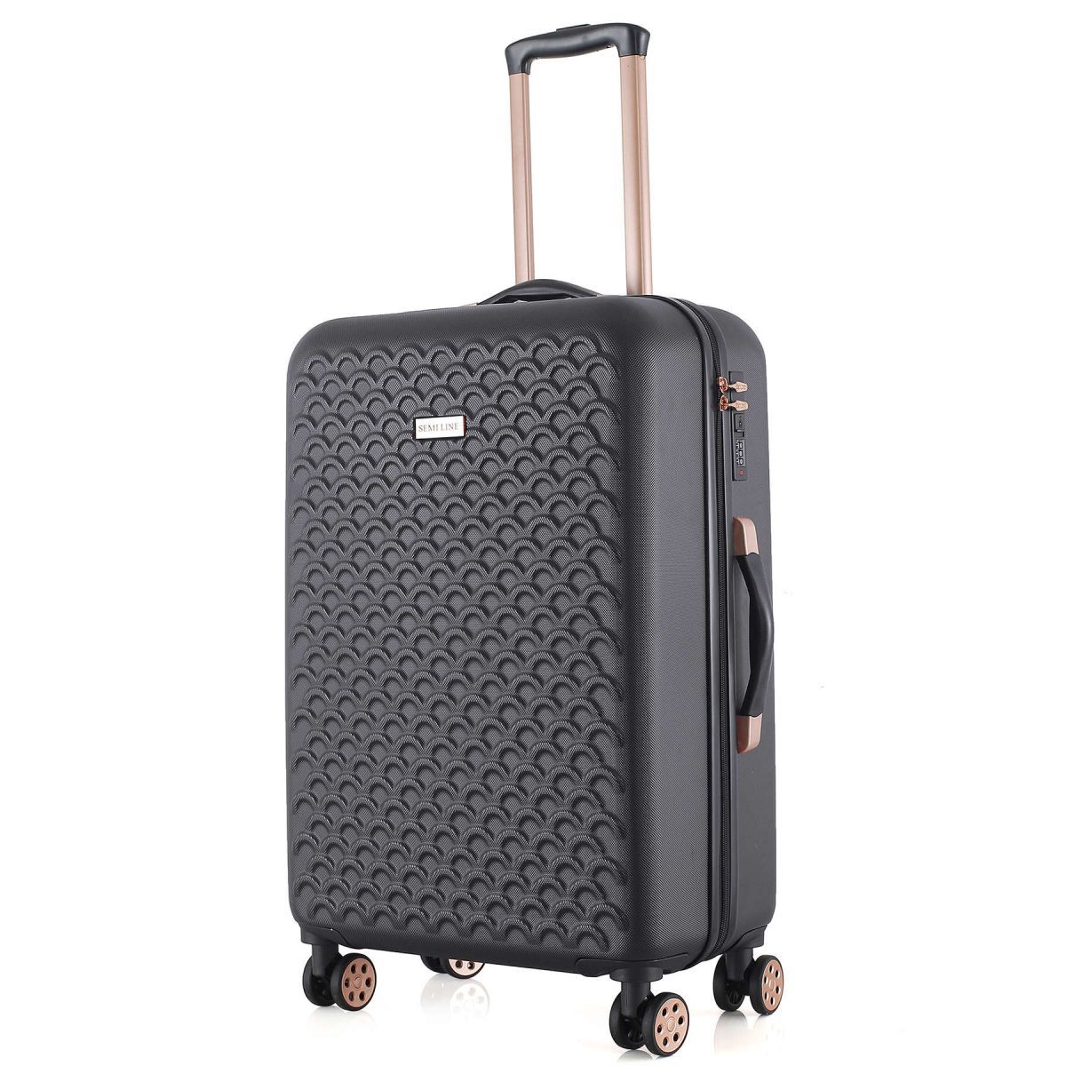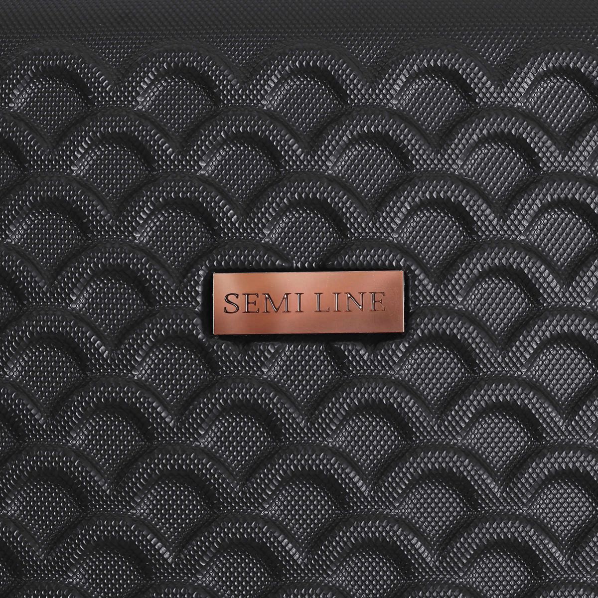 Чорна валіза Semi Line T5718 з численними металевими і пластиковими вставками під золото і хвилястим візерунком фасаду виглядає достатньо вишукано. Вона оснащена легкою алюмінієвою телескопічною ручкою, що фіксується в трьох положеннях, а ручки для перенесення валізи в руках виконані з приємного на дотик пластику Soft-Touch. "Утоплений" кодовий замок покликаний захистити вміст вашої валізи, а також не виступає над корпусом, отже його неможливо випадково пошкодити при транспортуванні валізи.