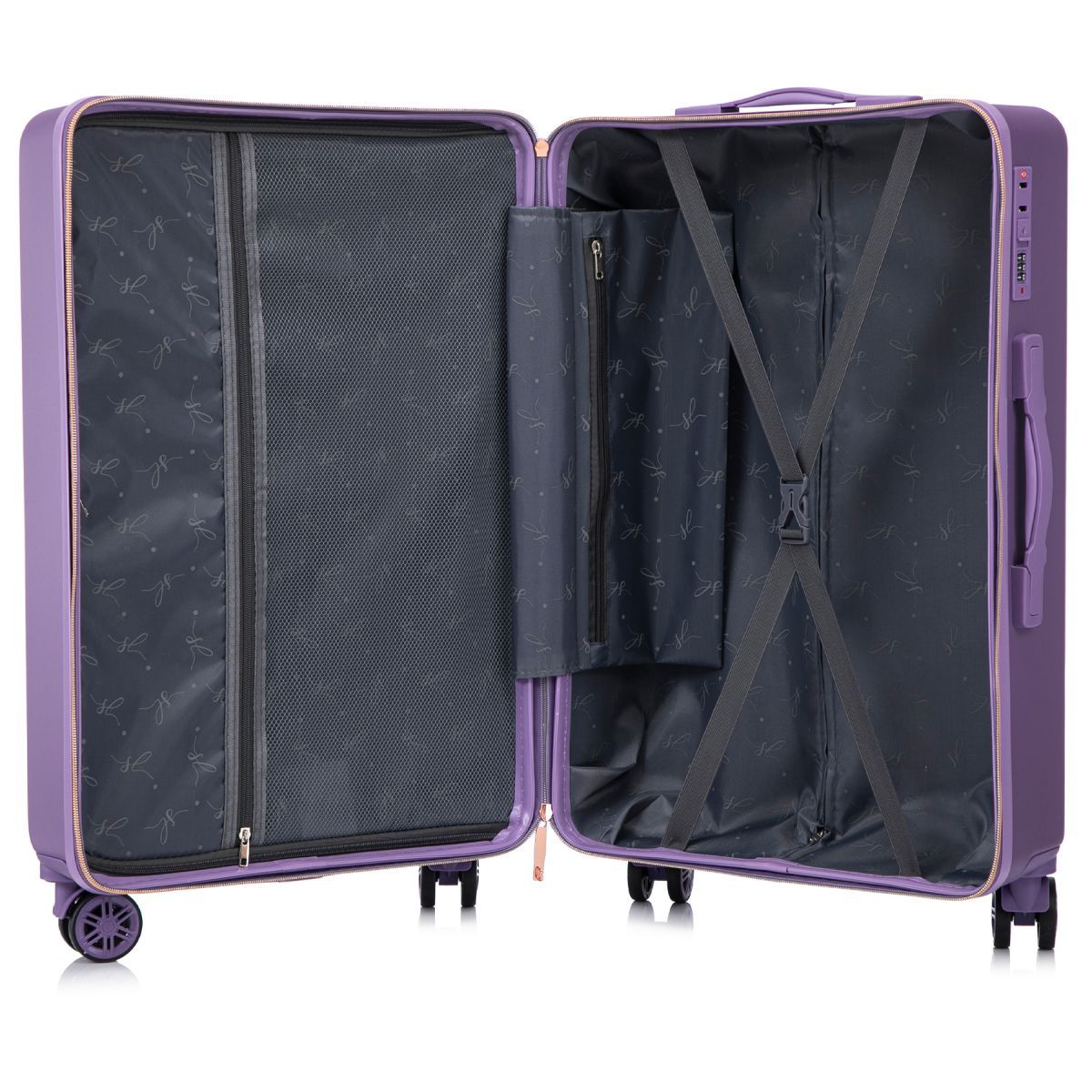 - Валіза має текстильну перегородку на блискавці, яка розділяє внутрішній простір на два основні відділення, та оснащена кишенею на блискавці для дрібних речей.