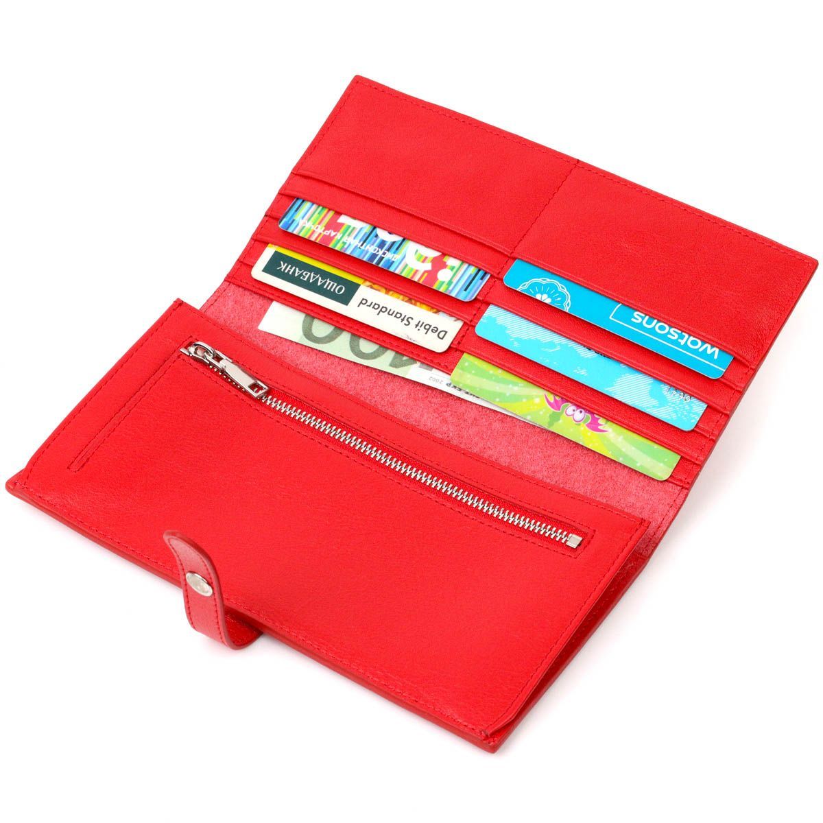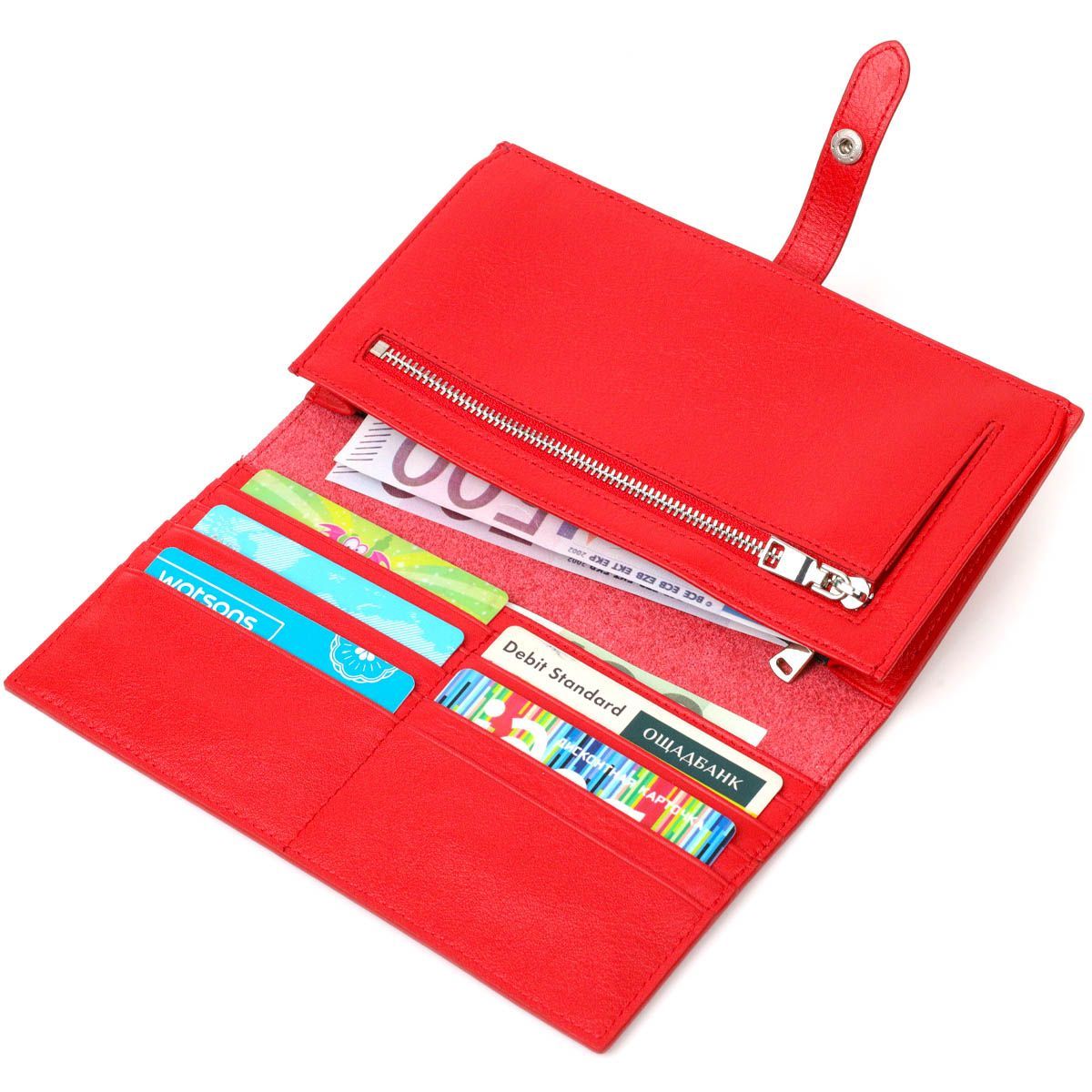 Стильный клатч из натуральной кожи для современных женщин. Аксессуар состоит из вместительного отделения для купюр, десяти ячеек для пластиковых карточек, карманчик на молнии, двух близлежащих карманов и монетницы. В изделии использована качественная фурнитура. Клатч закрывается хлястиком на кнопку, для удобства есть две кнопки, позволяющие увеличить объем аксессуара.