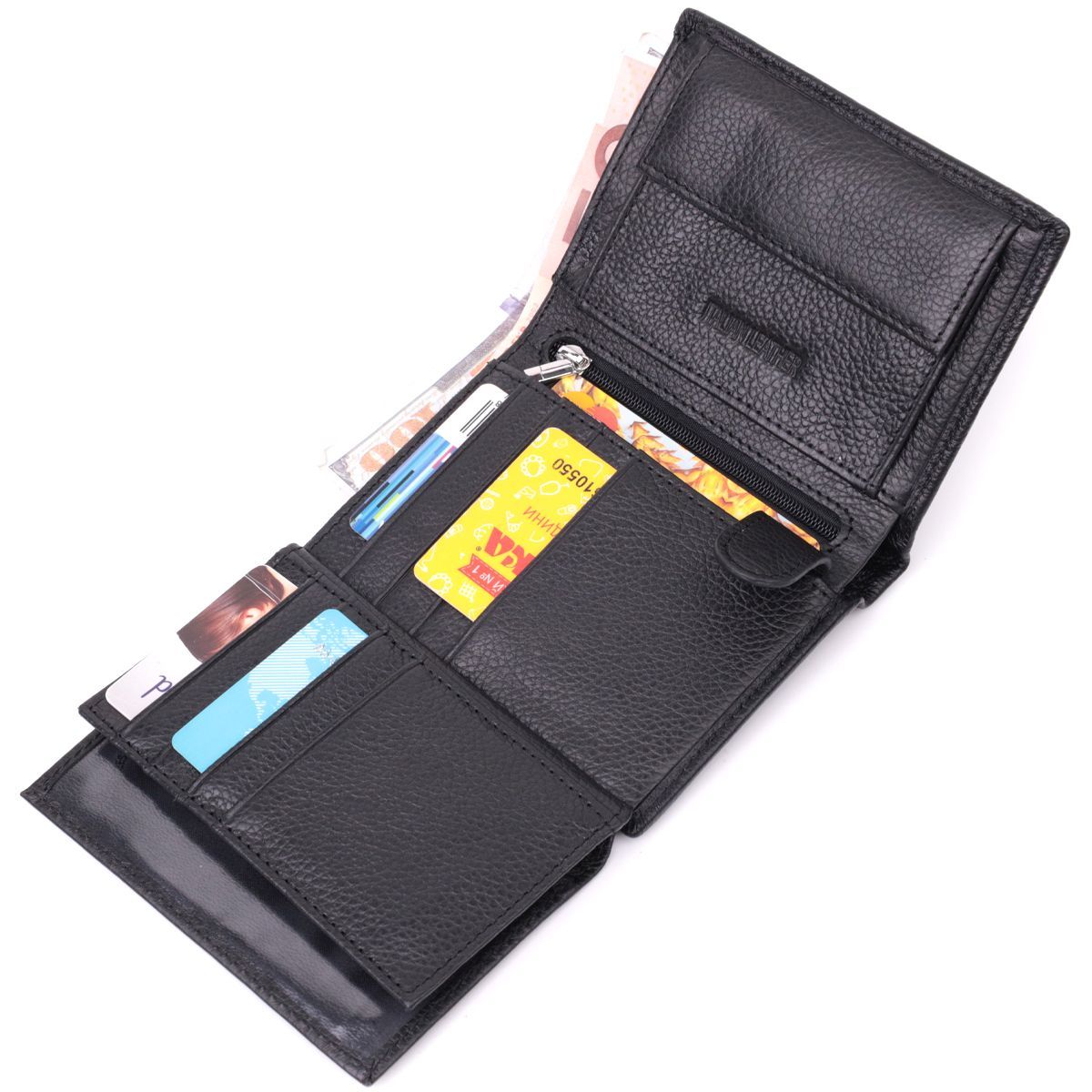 Чоловіче портмоне вертикального типу з тисненням логотипу виробника на лицьовій стороні. Аксесуар з натуральної шкіри, він складається з двох відділень для купюр, вертикальної кишені на блискавці, десяти осередків для карт, трьох кишень під плівкою, однієї прихованої кишені та кишені для монет. Портмоне доповнено надійною фурнітурою та міцною підкладкою, закривається навпіл без застібки. Шкіряне чоловіче портмоне - це завжди відмінна ідея подарунка для дорогих і улюблених чоловіків.