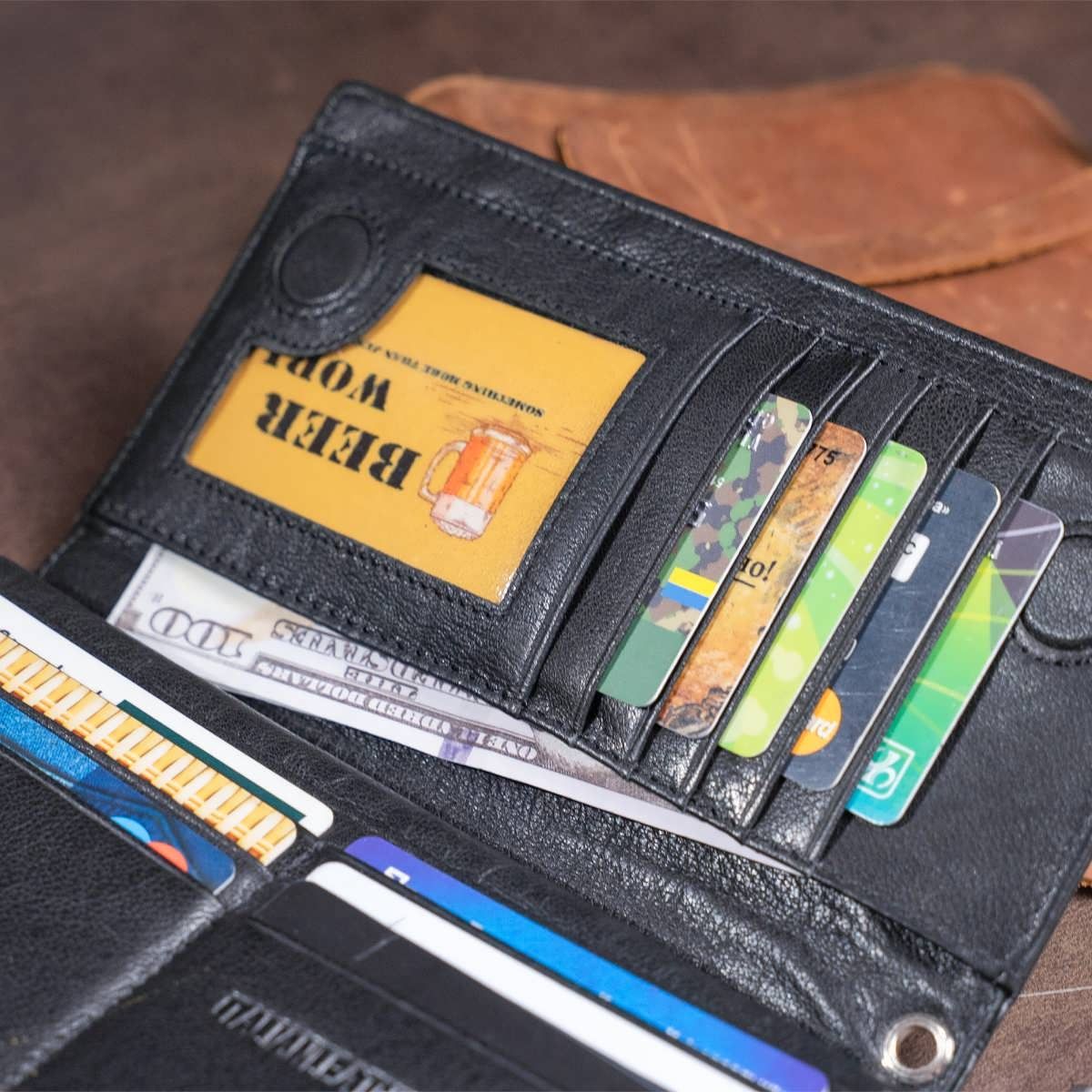 Вертикальный кошелек в виде книги с двумя автономными частями (одной для карточек и второй для купюр и монет). Изделие имеет оригинальный и практичный дизайн. Будет по душе любителям карт. В комплекте к кошельку идет ремешок-петелька на запястье. Изделие очень приятное и мягкое на ощупь. Если вы находитесь в поиске подарка, рекомендуем вам эту модель. В ней вам будет удобно носить карточки и купюры, что делает ее еще более универсальной. А классический черный цвет не привязывает к цветовой гамме в гардеробе.
