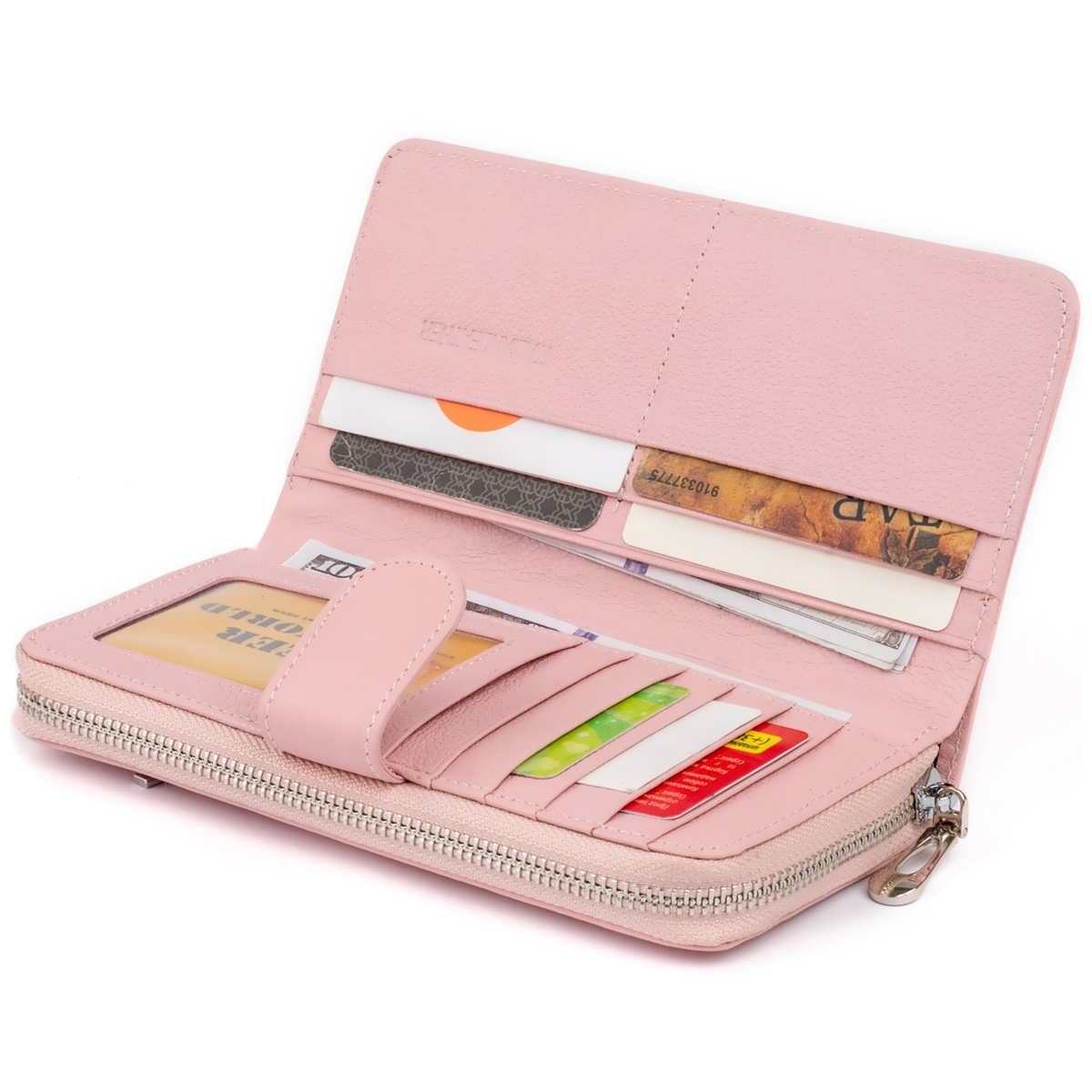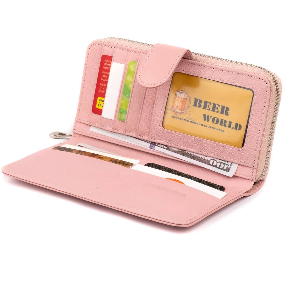 Массивный вместительный и функциональный женский кошелек из натуральной кожи. Производство – фабричный Китай. Внутри модели вы найдете карманы для купюр в развернутом виде, карманчик на молнии для монет, скрытые карманы и достаточно слотов для кредиток. Также в модель встроена автономная часть визиток. Уверены, что такой аксессуар оценят любители носить с собой карты скидок. Кошелек удобно лежит в руке и помещается в сумку. Нежный розовый цвет придает легкость и непринужденность. Аксессуар упакован в фирменную картонную коробку. Изделие подойдет как подарок для девушки всех возрастов. Заказывайте на нашем сайте данную модель по максимально доступной цене.
