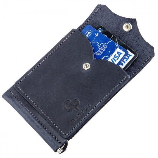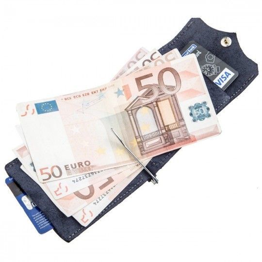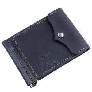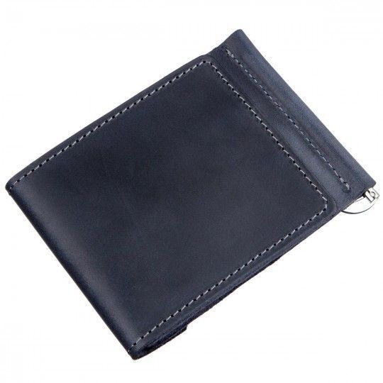 Компактний затиск із італійської натуральної шкіри найвищої якості синього кольору. На лицьовій стороні аксесуара тиснений логотип бренду-виробника і рівний синій рядок по краях аксесуара. Затискач стане вам ідеальним рішенням, якщо ви не є шанувальником портмоне або клатчею. За рахунок свого компактного розміру затискач легко поміститься в кишеню або невелику сумку. Ви також можете покласти в нього пару необхідних кредиток. Сама конструкція затиску виготовлена з надійного металу. Виріб стане чудовим подарунком для близької людини. Модель упакована у повстяний чохол.