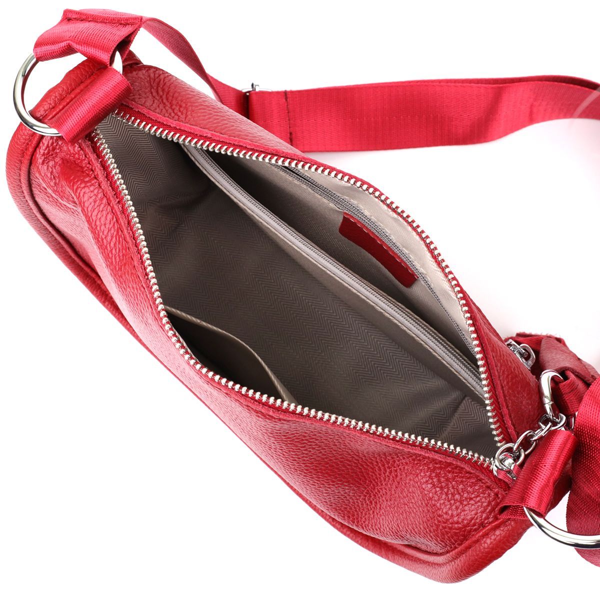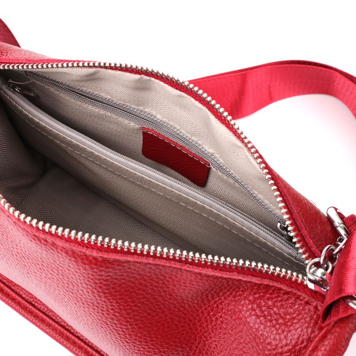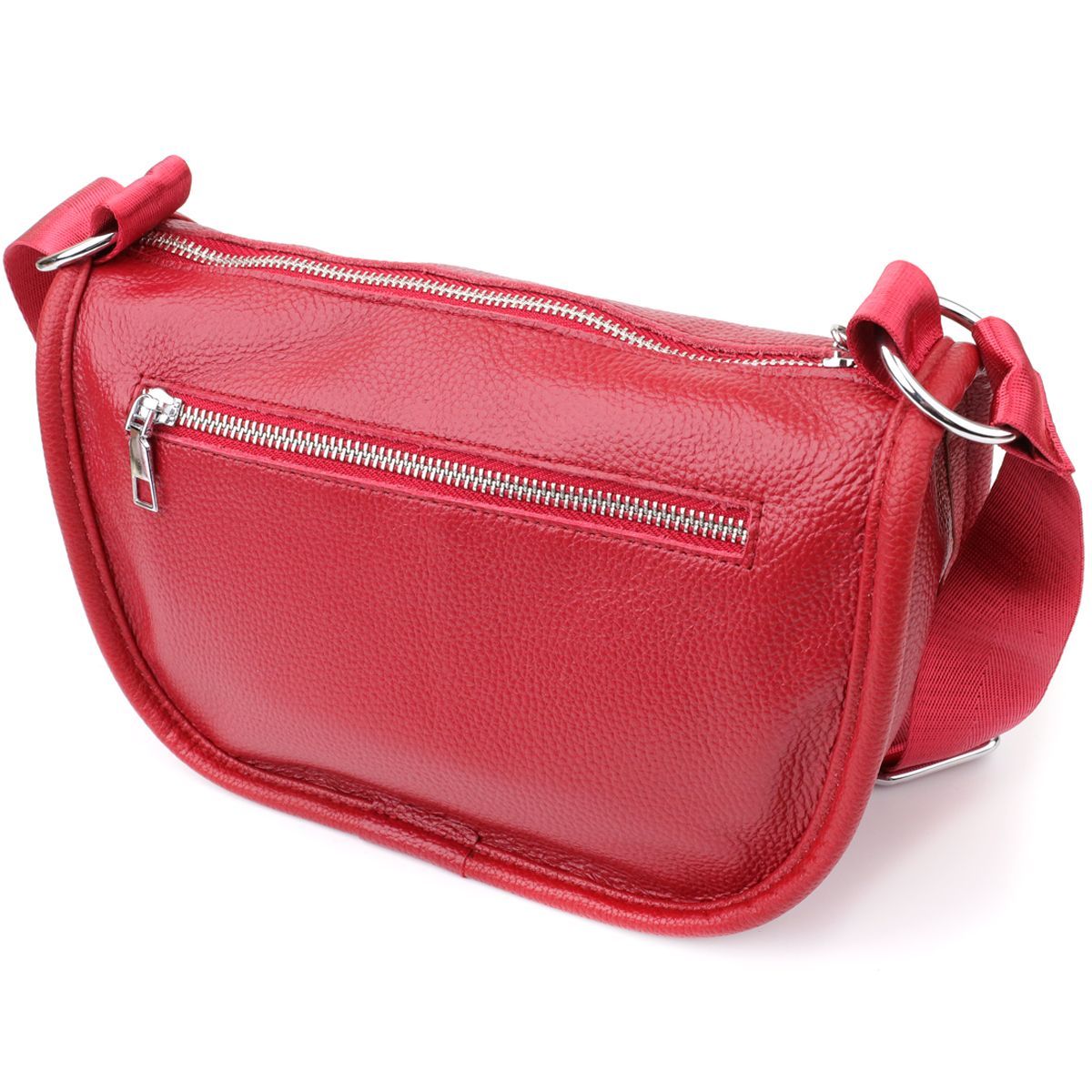 Жіноча шкіряна сумка у насиченому червоному кольорі виконана з якісної зернистої шкіри та має напівкруглу акуратну форму, що підкреслює яскравість та стиль образу. Особливу увагу привертає декоративний бігунок у вигляді стильного брелка, який надає моделі індивідуальності та виразності. Сумка закривається на блискавку, всередині розташоване основне відділення із двома кишенями на блискавці та двома відкритими кишенями для дрібниць, на тильній стороні є зовнішня кишеня на блискавці. Незнімний текстильний ремінь забезпечує комфортне носіння, а фурнітура під срібло гармонійно відтінює насичений червоний тон шкіри. Ця сумка стане ефектним та практичним аксесуаром для повсякденних образів та особливих випадків, поєднуючи стиль, функціональність та увагу до деталей.