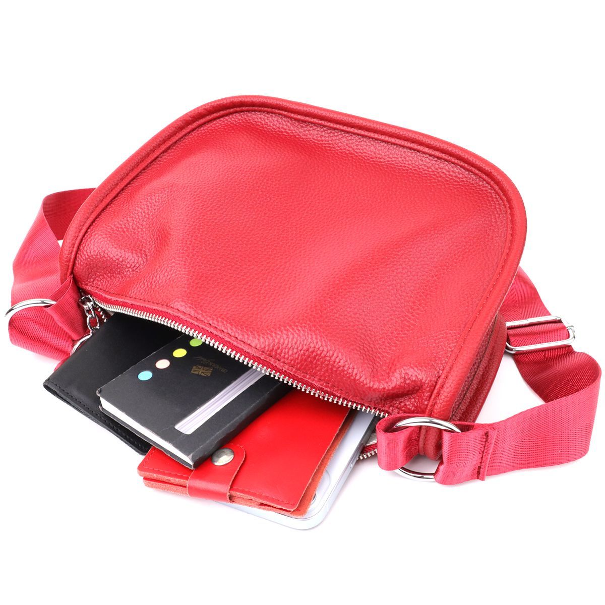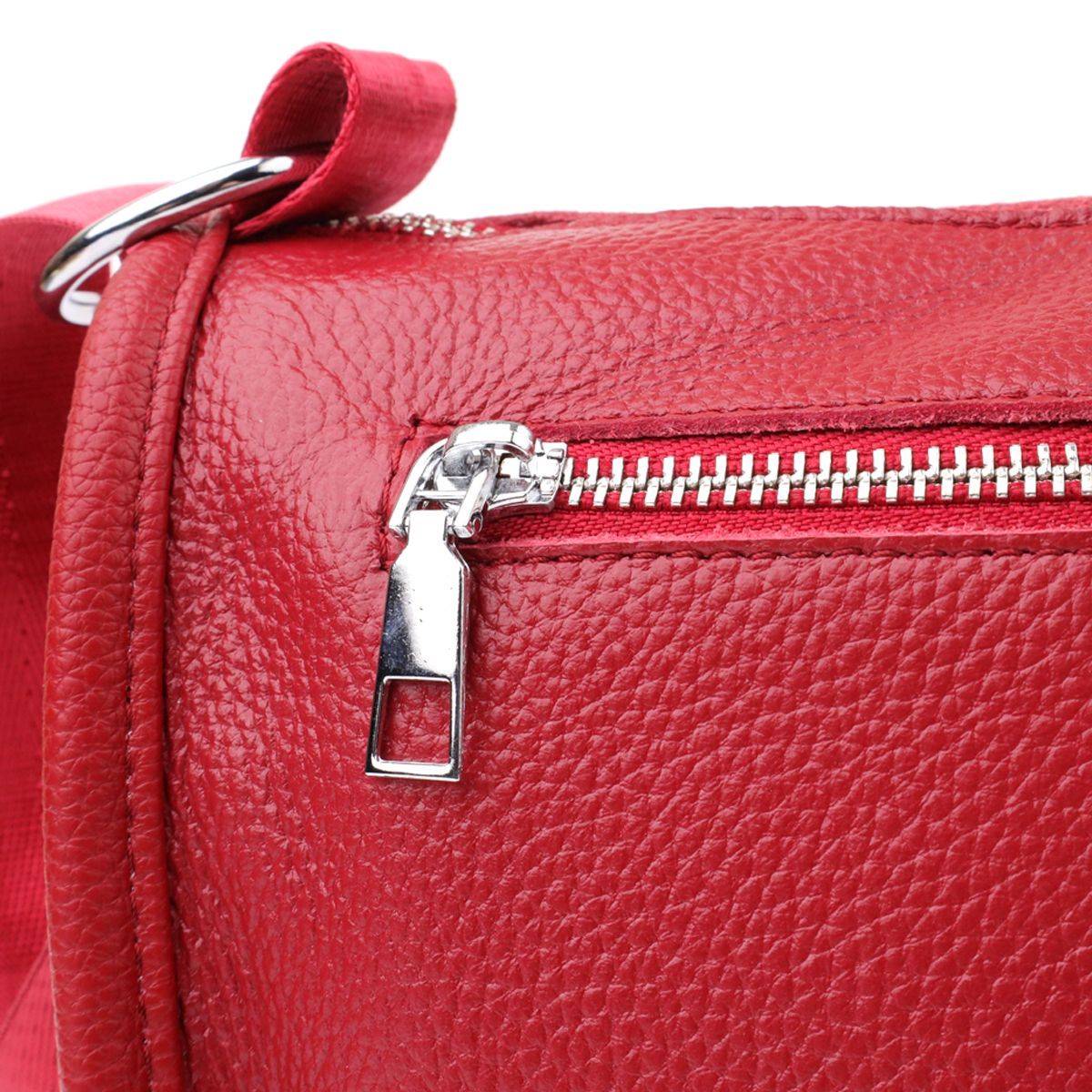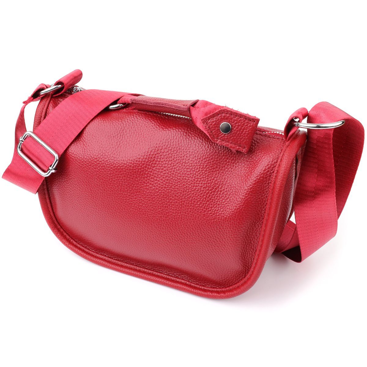 Жіноча шкіряна сумка у насиченому червоному кольорі виконана з якісної зернистої шкіри та має напівкруглу акуратну форму, що підкреслює яскравість та стиль образу. Особливу увагу привертає декоративний бігунок у вигляді стильного брелка, який надає моделі індивідуальності та виразності. Сумка закривається на блискавку, всередині розташоване основне відділення із двома кишенями на блискавці та двома відкритими кишенями для дрібниць, на тильній стороні є зовнішня кишеня на блискавці. Незнімний текстильний ремінь забезпечує комфортне носіння, а фурнітура під срібло гармонійно відтінює насичений червоний тон шкіри. Ця сумка стане ефектним та практичним аксесуаром для повсякденних образів та особливих випадків, поєднуючи стиль, функціональність та увагу до деталей.
