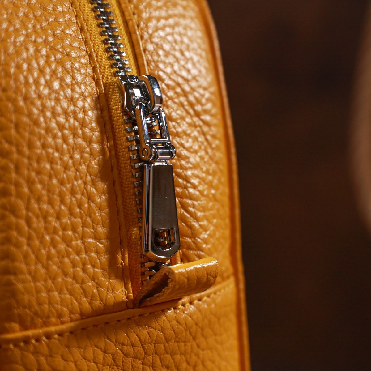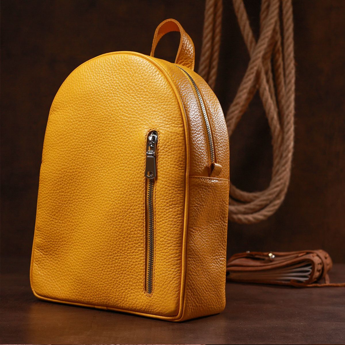 Очень красивый женский рюкзак в насыщенном желтом цвете от украинского производителя. Изготовлено изделие из натуральной кожи с высокой прочностью и износостойкостью. Внутри есть одно просторное отделение, карман на молнии и карман для телефона. На внешней стороне есть вертикальный карман на молнии, что очень удобно и практично.