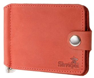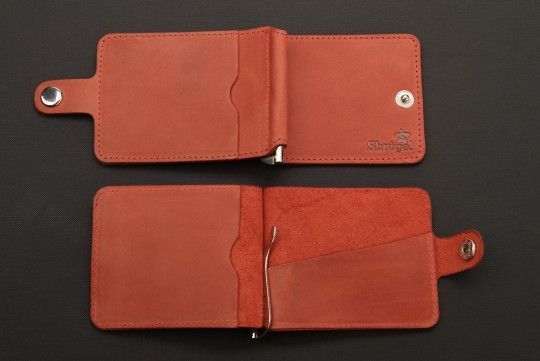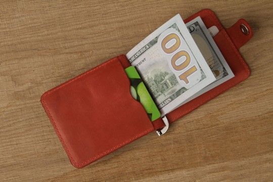 Стильный кожаный зажим красного цвета. Аксессуар выполнен из натуральной высококачественной винтажной кожи. Цвет фурнитуры: серебро. Изделие аккуратно прошито сверхпрочной красной нитью. На задней стороне аксессуара находится кармашек для пластиковых карточек. Зажим упакован в фирменный текстильный чехол.