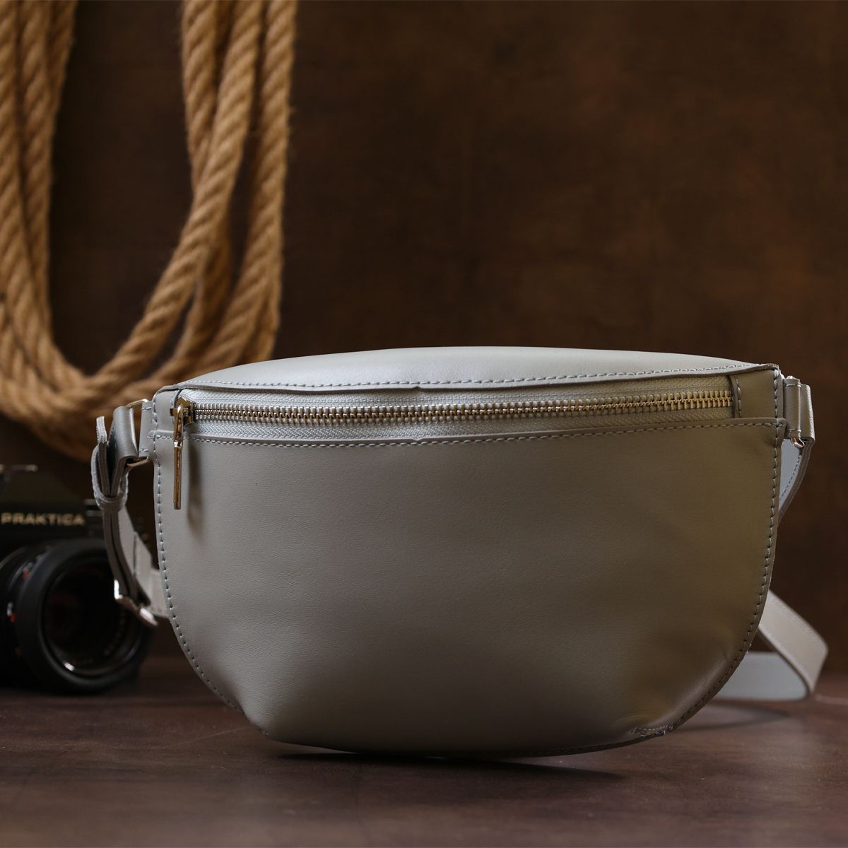 Великолепная женская сумка-бананка в сером трендовом цвете с гладкой фактурой. Выполнена модель из натуральной кожи высокого качества и прочности. В этом изделии имеется одно вместительное отделение, в которое легко поместится телефон, ключи и другое. Такую сумку можно подарить дорогому человеку на любой праздник.