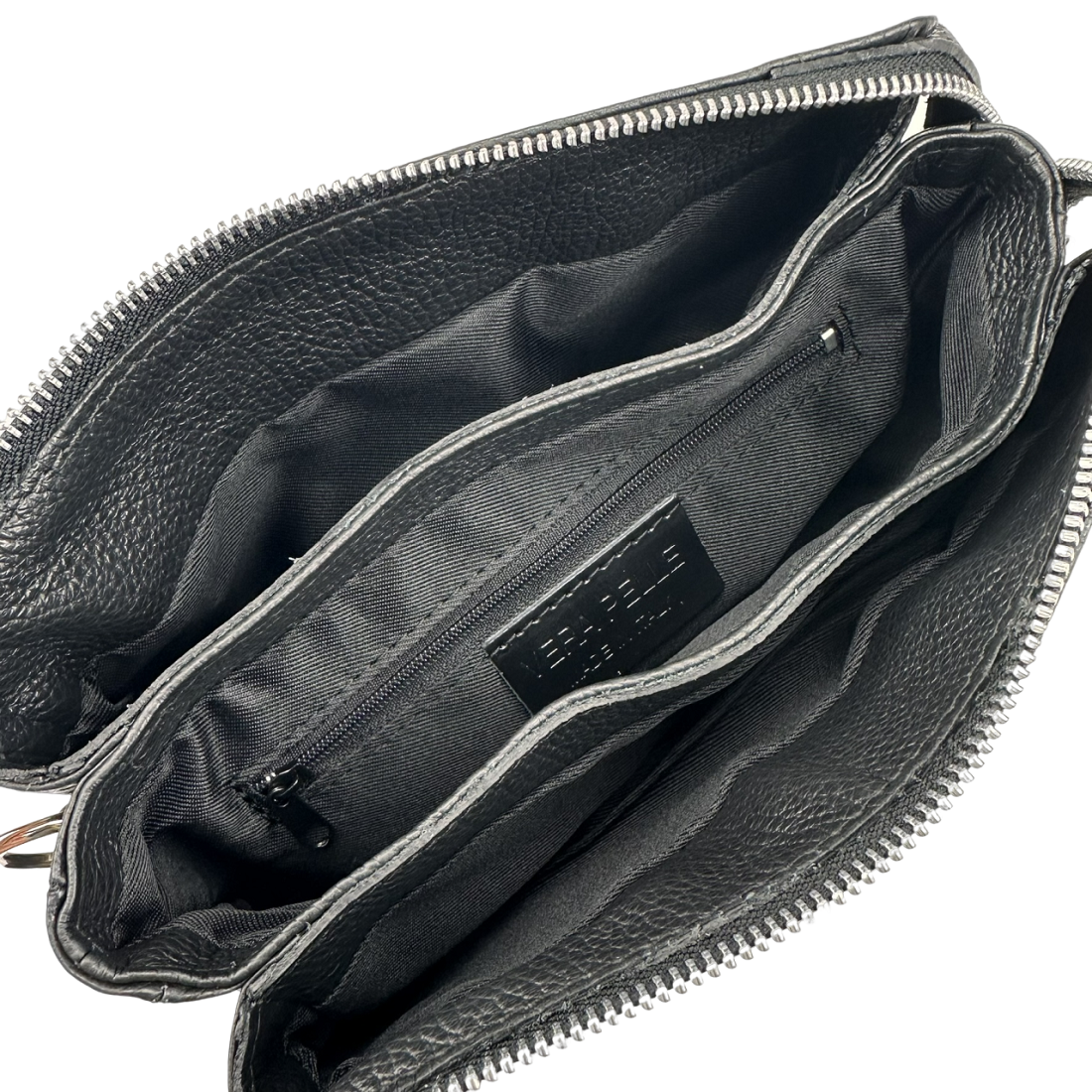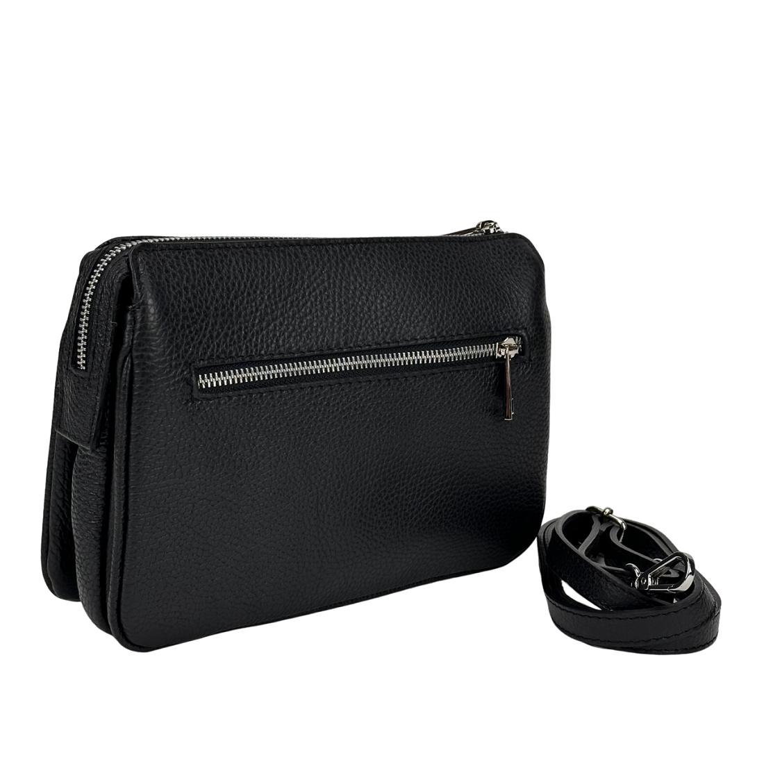 Жіноча чорна невелика сумка Firenze Italy F-IT-9871A виготовлена з натуральної шкіри. Особливості: розмір сумки становлять 25 x 18 x 9 см. Сумка має одне основне відділення на блискавці. Усередині є дві перегородки, що поділяють виріб на три частини однакового розміру. Також усередині розташована додаткова невелика таємна кишенька на змійці. Сумочка має щільну структуру, навіть у порожньому вигляді добре утримує форму. У комплекті шкіряний ремінець на плечі на карабінах. Підкладка: текстиль. Колір чорний. Колір фурнітури золото.