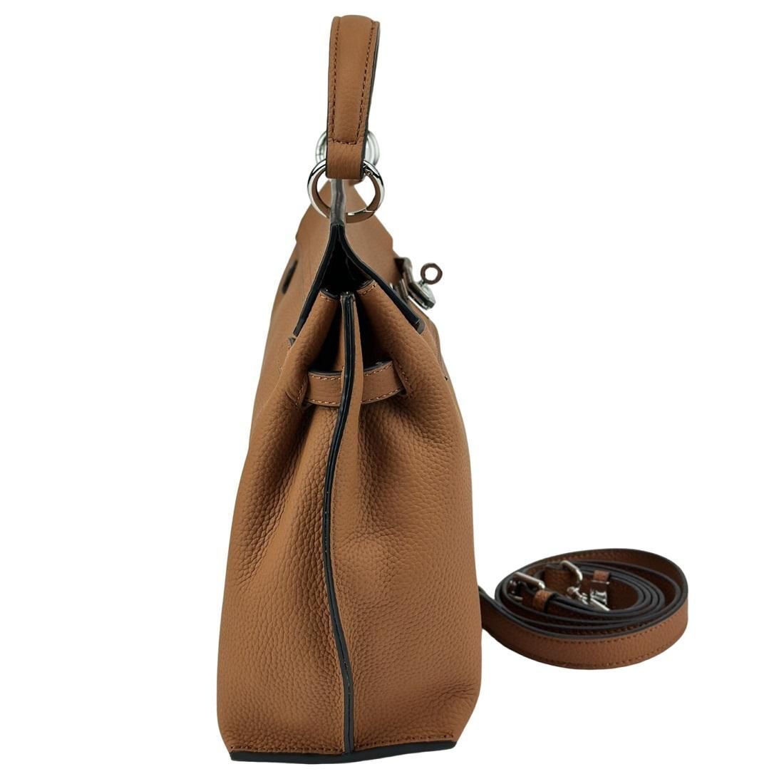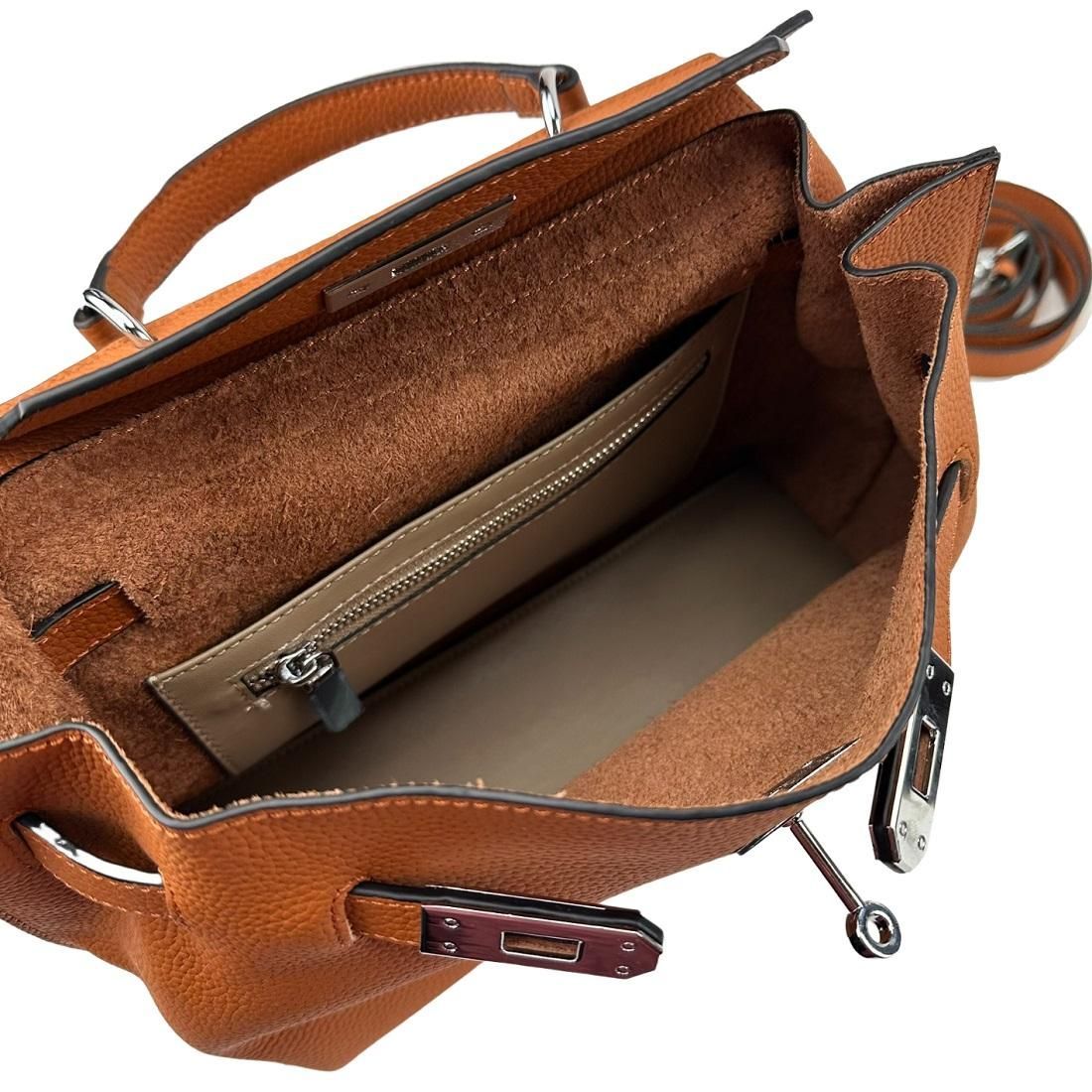 Жіноча класична сумка невелика Olivia Leather A25F-W-55-89C має розміри 27,5(22,5) x 21,5 x 9,5 см. Сумка оснащена одним основним відділенням, яке закривається за допомогою клапана, та має внутрішні додаткові кишені для дрібних предметів. Наплічний довгий ремінець зі шкіри регулюється по довжині та відстібається за допомогою карабінів. Сумочка стоїть на металевих ніжках, не має підкладки. Виконана в коричневому кольорі з сріблястою фурнітурою.